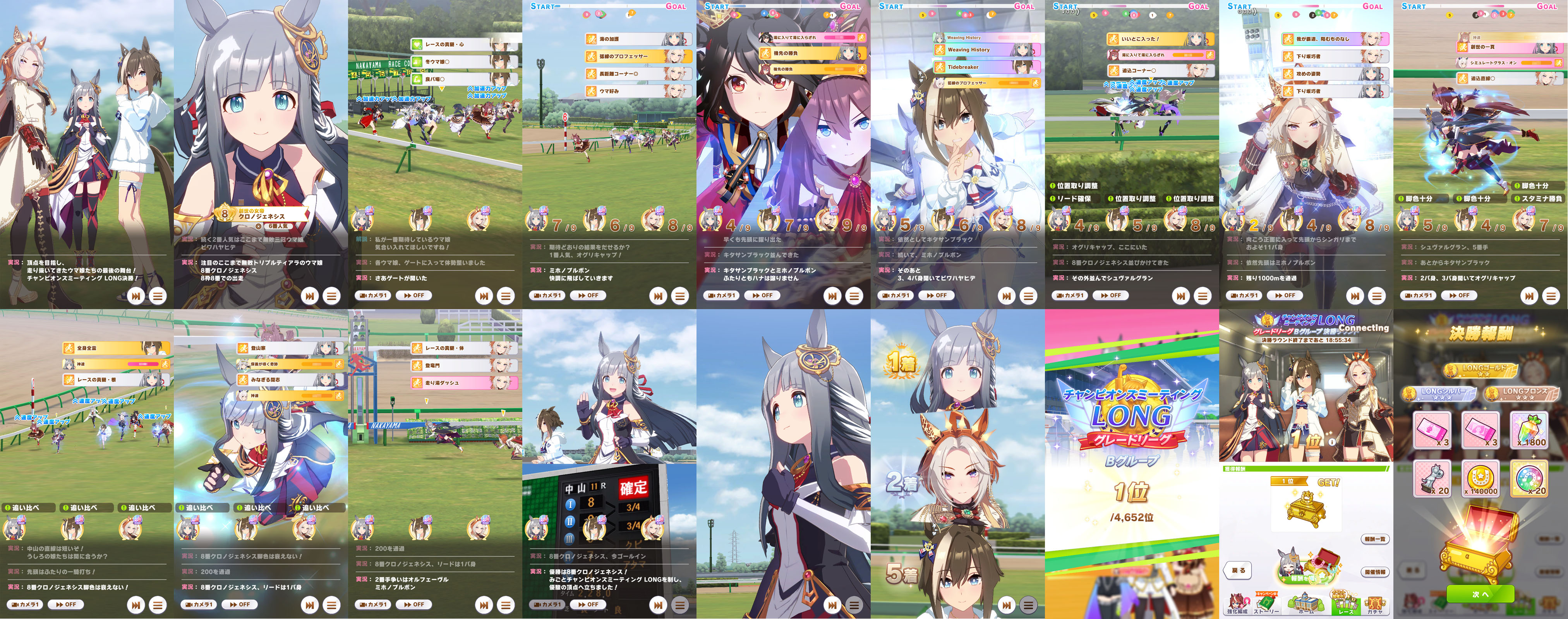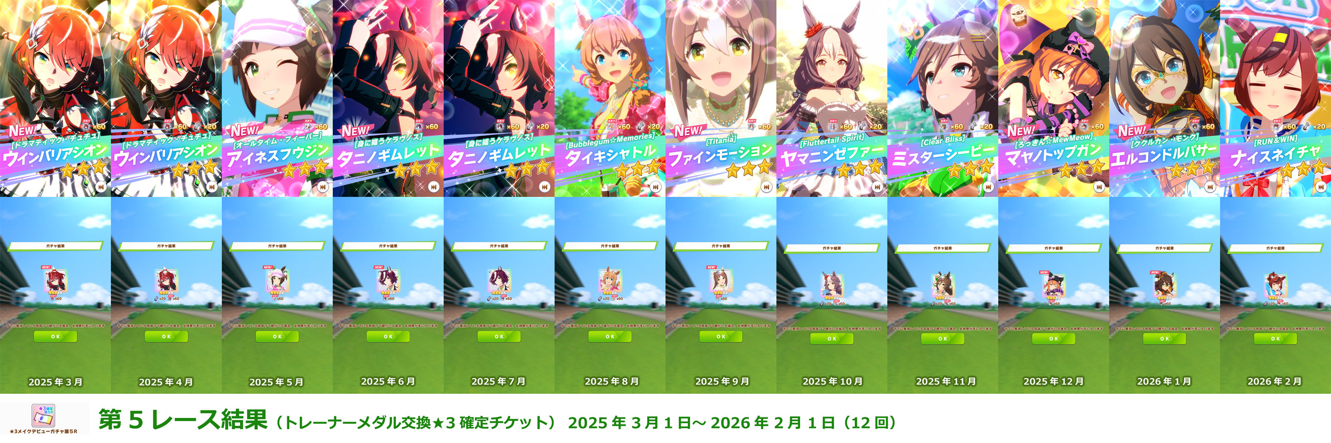 第5レースが終了しました。1年間の結果は、未所持が 6人、勝負服違いも所持していない完全未所持は 2人でした。2連続シオンからの 2連続ギムという珍事もありましたが、50%(6/12)は上出来です。例年通りなら、来月から第6レースが始まります。第6Rガチャチケットは、輩出対象のウマ娘が40人増えて217人になる見込みです。