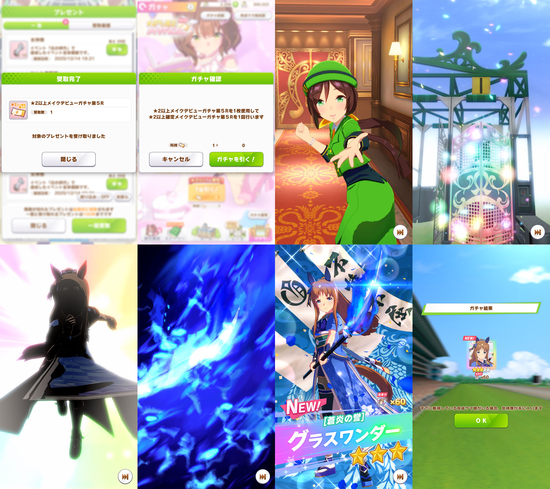 イベント「白の時代」の報酬でゲットした★2以上確定チケットを引いたところ、確定扉演出からの虹ゲートでブルーグラスこと蒼炎の誉グラスワンダーをお迎えしました。★2/SR確定チケットの虹昇格は、これが 8回目です(7, 6, 5, 4, 3, 2, 1)。