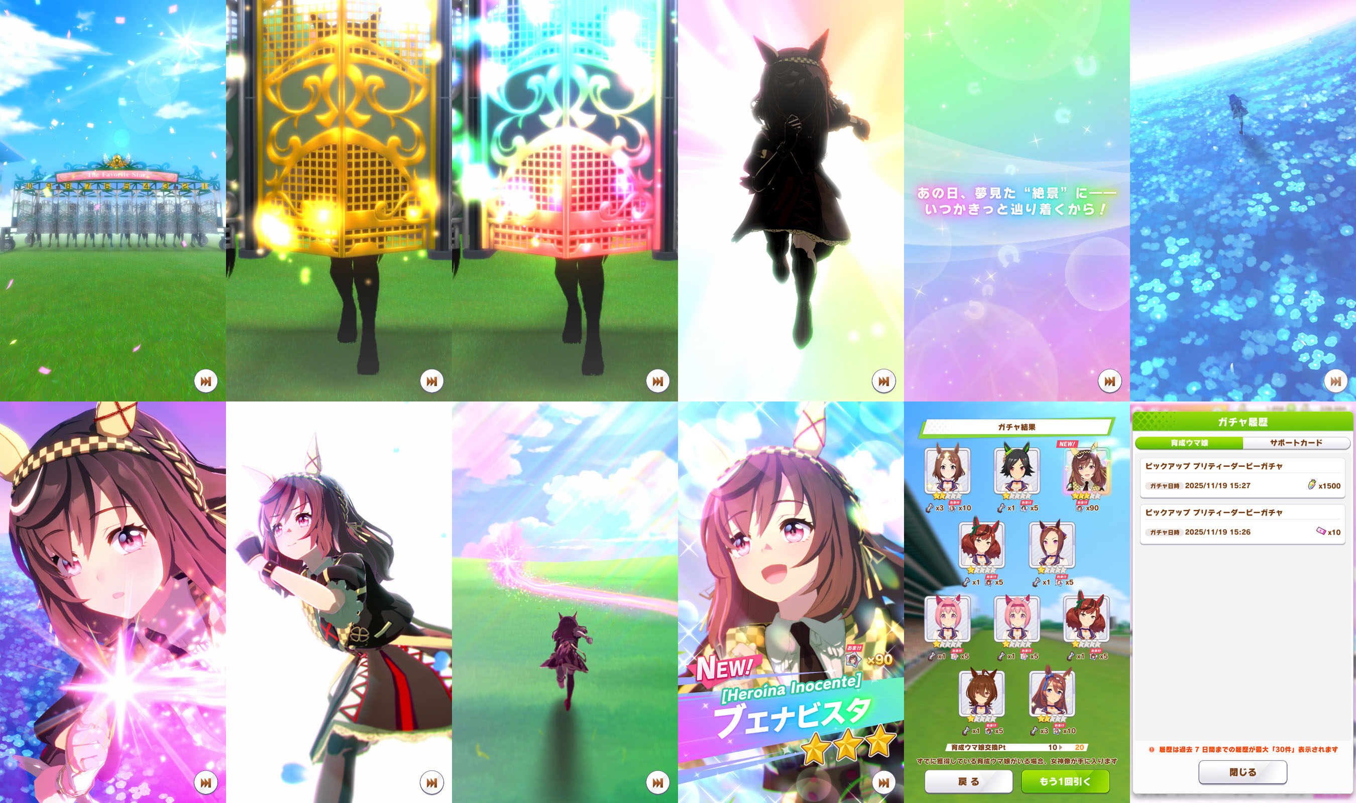 ガチャチケット×10枚、無償ジュエル×10回の計20連でブエナビスタお迎えしました。Favorite Starゲートからの銀→金→虹の二段昇格でした。エスポ天井、ダンツ166連と 2回で計366連の絶不調でしたが、一気に挽回です。
