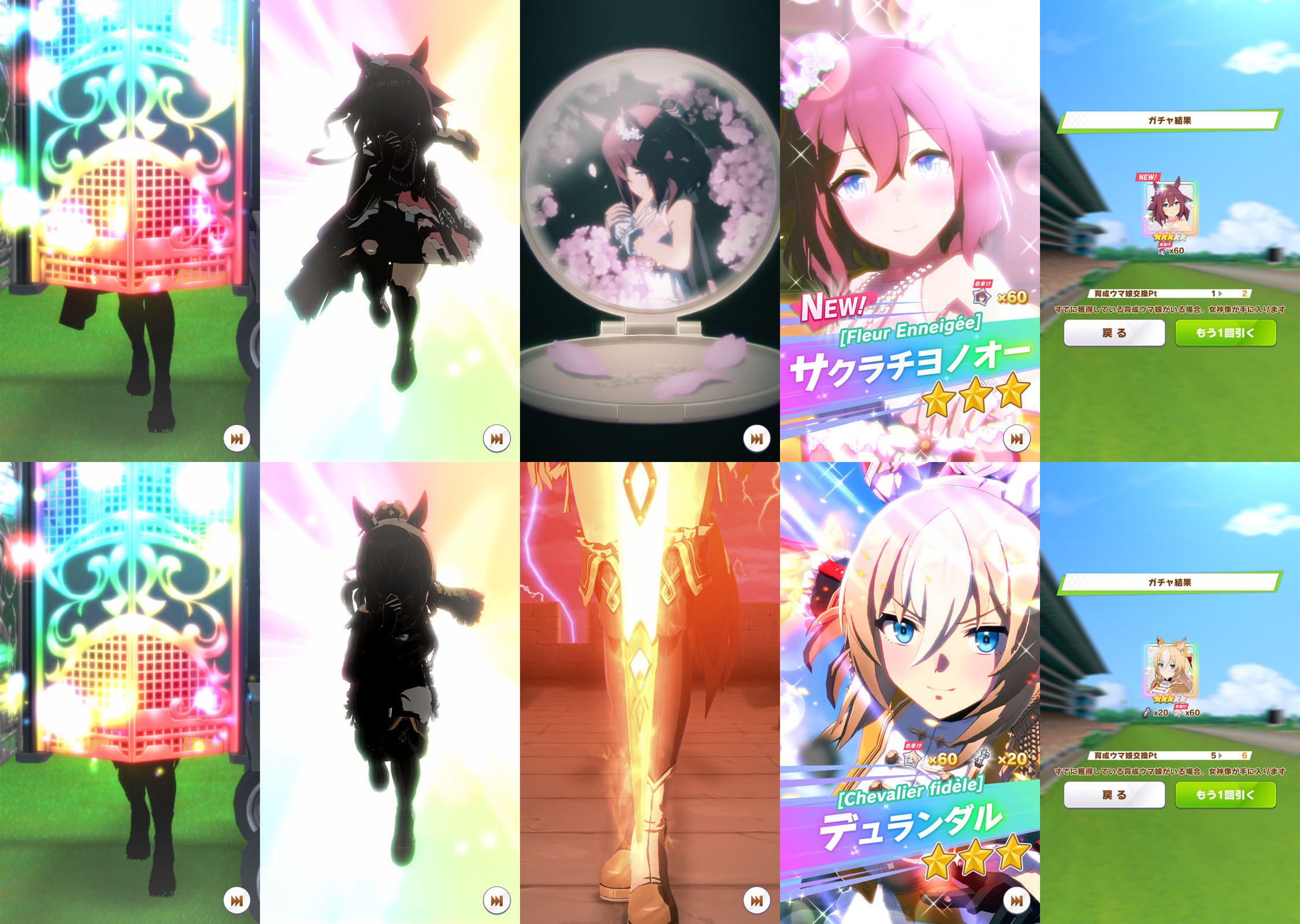 と考えて、ガチャチケット10枚を使って単発ガチャを引いたところ、2回目にドロワチヨちゃん(サクラチヨノオー)、6回目にデュランダルをお迎えしました。デュラは被りですが、ドロワチヨちゃんは未所持でした。やっぱり、ウマ娘のガチャは出る時と出ない時の偏りがありますね(もちろん、確率的には十分にあり得る範囲なのですが)。