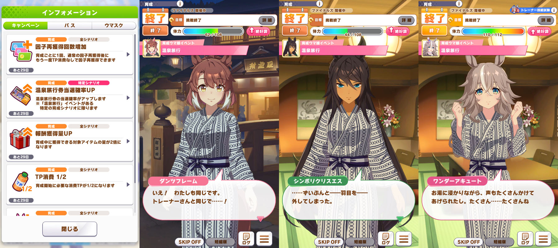 温泉旅行券当選確率アップ期間が来ました。ダンツフレーム、シンボリクリスエス、ワンダーアキュートの 3人と温泉に行って、所有しているウマ娘107人全員と温泉旅行に行くことができました。温泉旅行チャレンジ コンプリートです(4回目)。