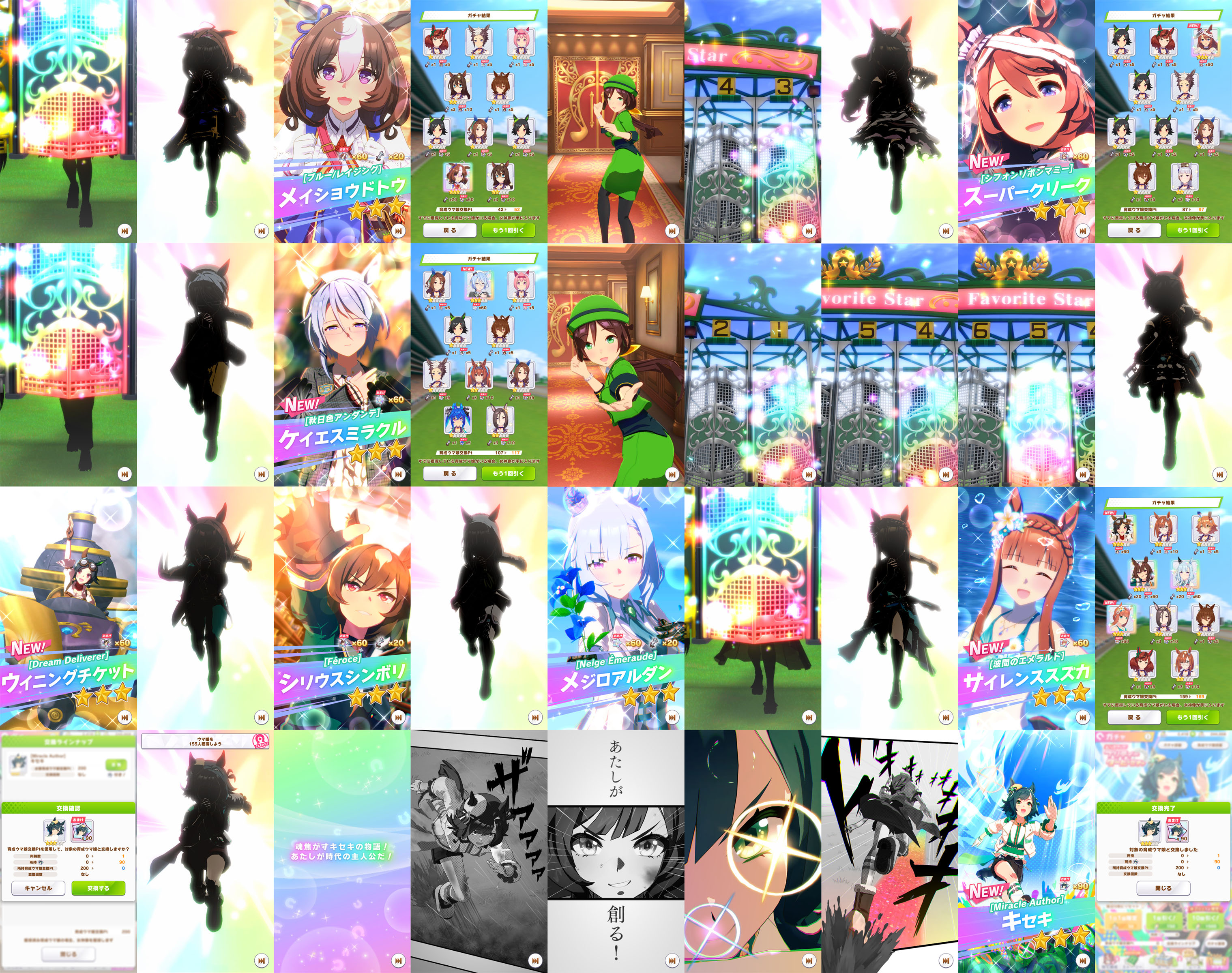 キセキのガチャ結果は、エスポ以来、6回目の天井でした。ピックアップすり抜けは、ドトウ、マミークリーク、コーラスケイちゃん、スチームチケゾー、シリウス、ドロワアルダン、水着スズカの 7人(3.5%)で、未所持は 7人中 4人。