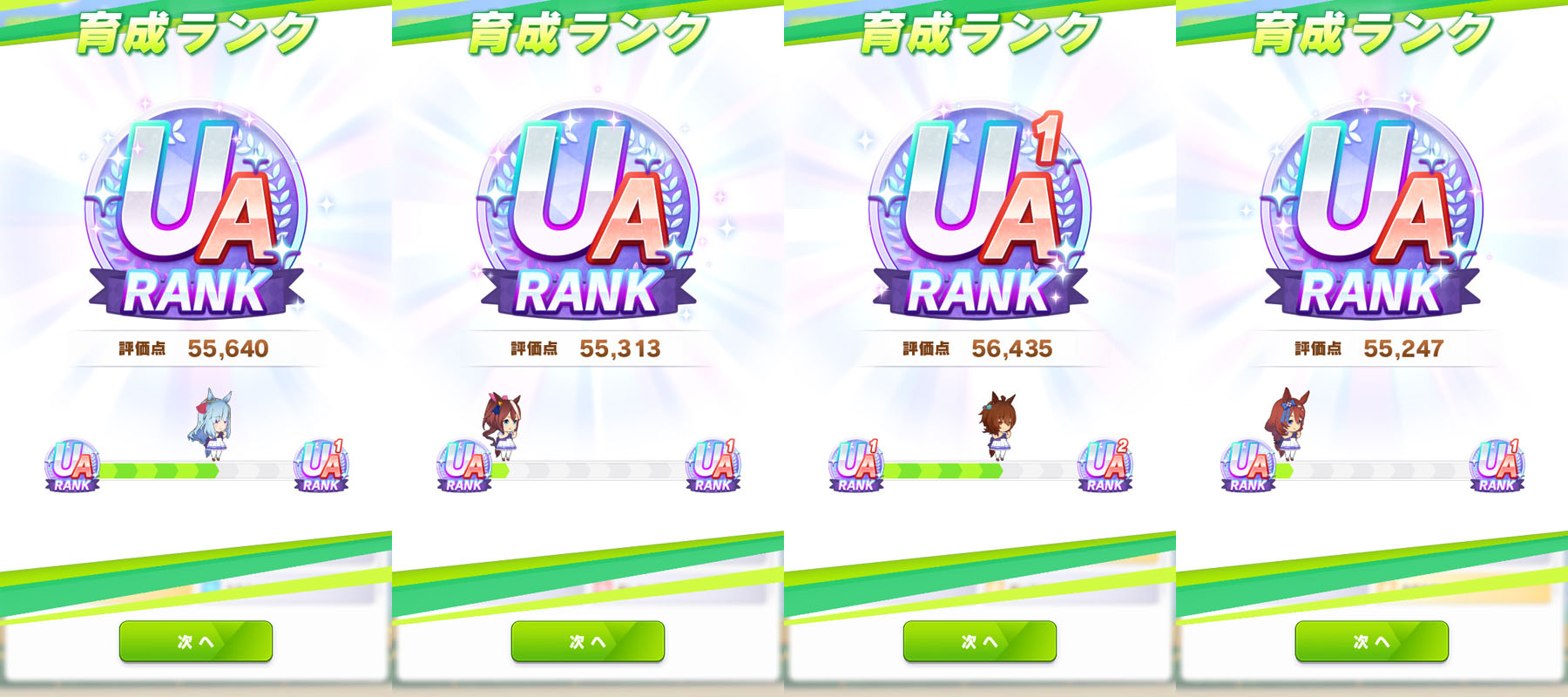 新育成シナリオ実装以降、おまかせ育成を続けているのですが、66回育成して 4回ランクUAに到達しました。ランクUB6~4が最も多いのですが、時々上振れます。もちろん手動育成には及びませんが、名鑑ポイントを稼ぐだけならおまかせ育成でも十分です。名鑑はLv260に到達しましたが、おまかせ育成でまだまだ上を狙えます。