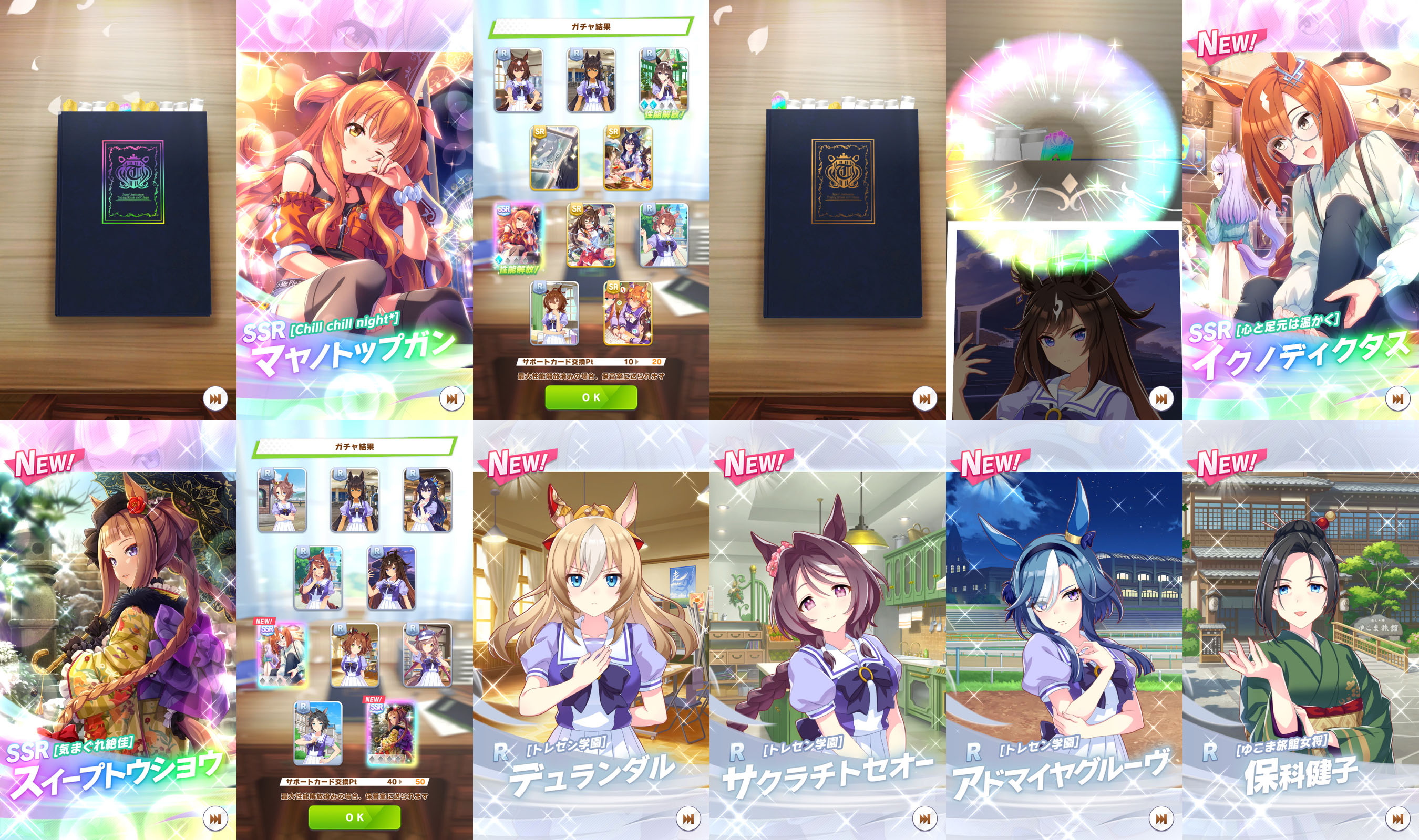 特別マニーショップで交換した確定ガチャチケットの結果は……残念。★3確定チケットは、バカンスタルマエとマルゼンスキーでどちらも被り、SSR確定チケットはSPテイオーと舞踏会マック、★2/SR確定チケットの虹昇格は保母ケイちゃんの 1枚のみ。バカンスタルマエが★4に才能開花できただけでも良しとします。