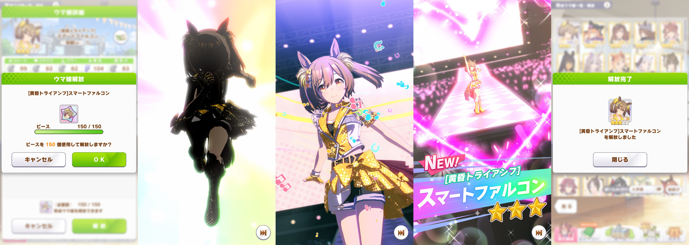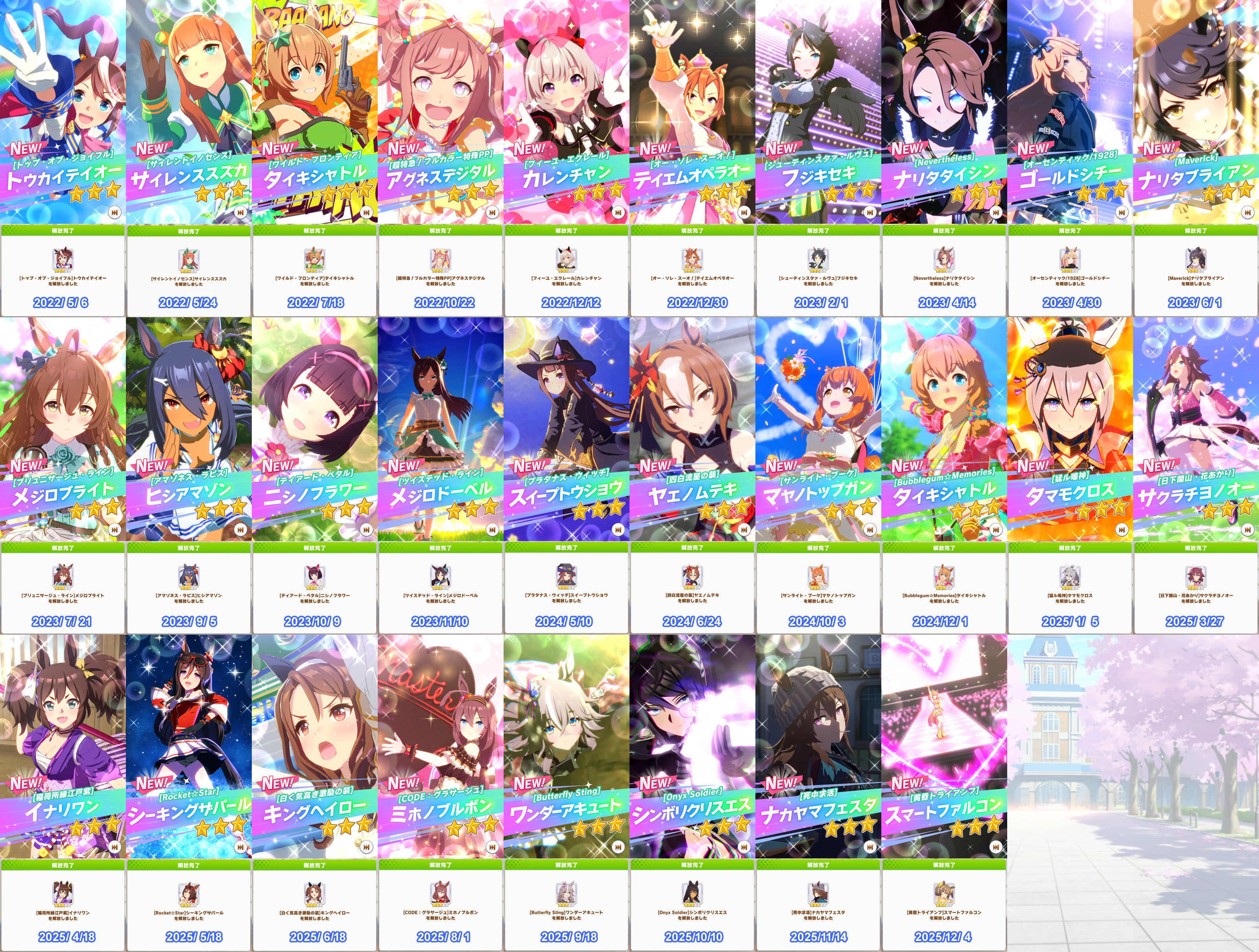 これで、テイオー、スズカ、タイキ、デジたん、カレン、オペ、フジ先輩、タイシン、シチー、ブライアンちゃん、ブライト、ヒシアマ姐さん、フラワー、ベル、スイーピー、ヤエノ、ウエディングマヤノ、バカンスタイキ、駿大祭タマちゃん、チヨちゃん、イナリ、パール、チアキング、グラサージュブルボン、アキュート、クリスエス、フェスタの計27人のウマ娘をピース150個でキャラ解放しました。次は、12月 5日にトライアンフファル子、12月31日に振袖オペ、2月15日にウエディングカレン、3月25日にサンタスカーレットをピース解放する予定です。