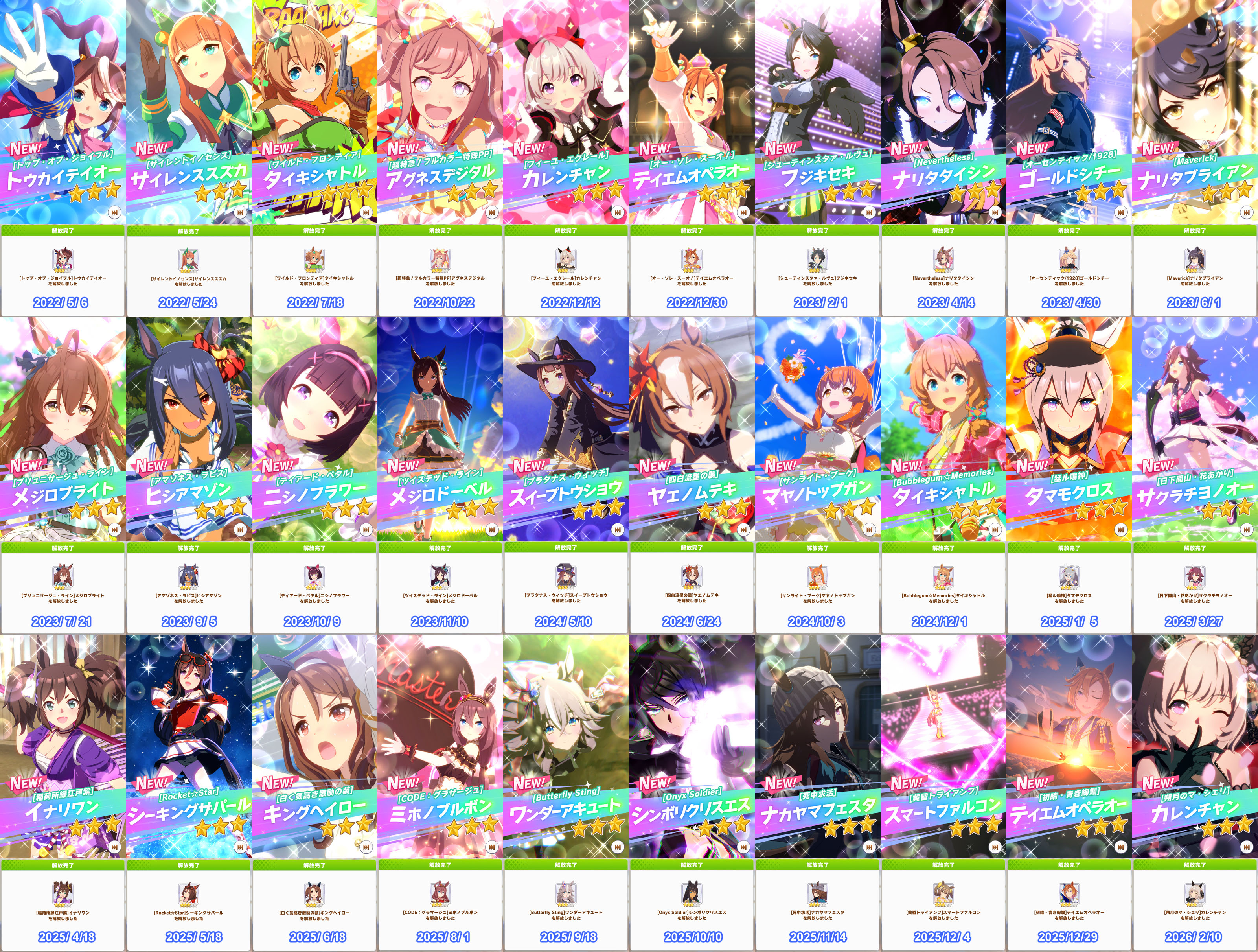 これで、テイオー、スズカ、タイキ、デジたん、カレン、オペ、フジ先輩、タイシン、シチー、ブライアンちゃん、ブライト、ヒシアマ姐さん、フラワー、ベル、スイーピー、ヤエノ、ウエディングマヤノ、バカンスタイキ、駿大祭タマちゃん、チヨちゃん、イナリ、パール、チアキング、グラサージュブルボン、アキュート、クリスエス、フェスタ、トライアンフファル子、振袖オペ、ウエディングカレンの計30人のウマ娘をピース150個でキャラ解放しました。次は、3月18日にサンタスカーレットをピース解放する予定です。