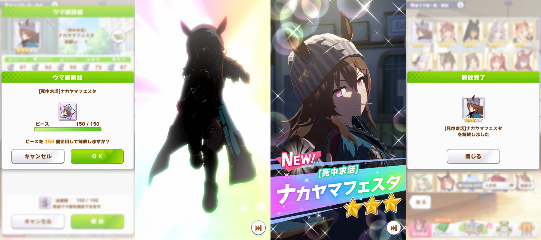 11月15日にナカヤマフェスタをピース150個でキャラ解放する予定ですが、確率アップ期間中にお迎えできるため、すぐに温泉に行ける見込みです。