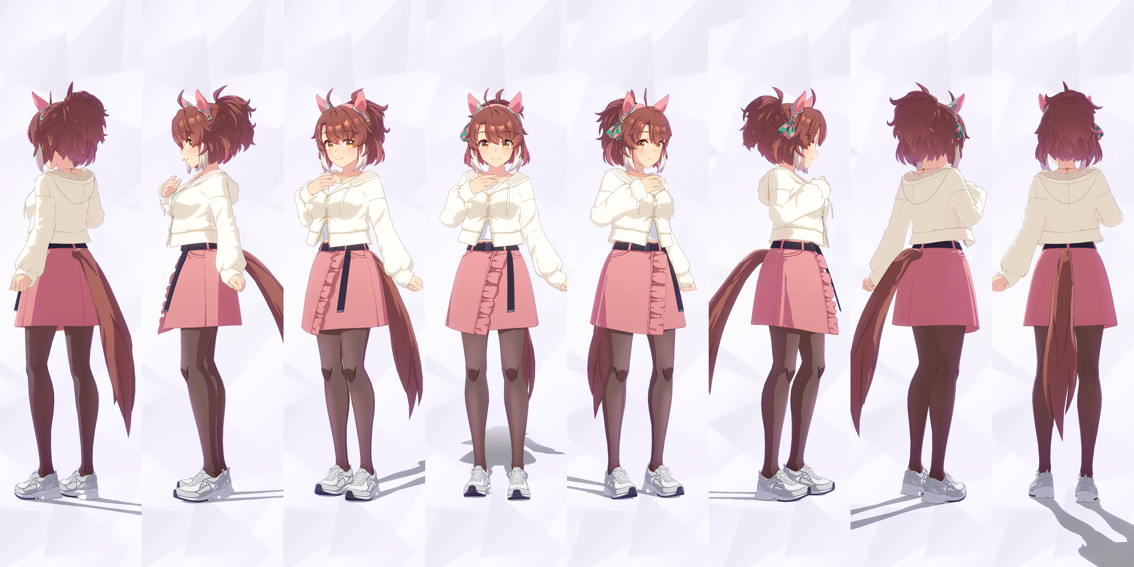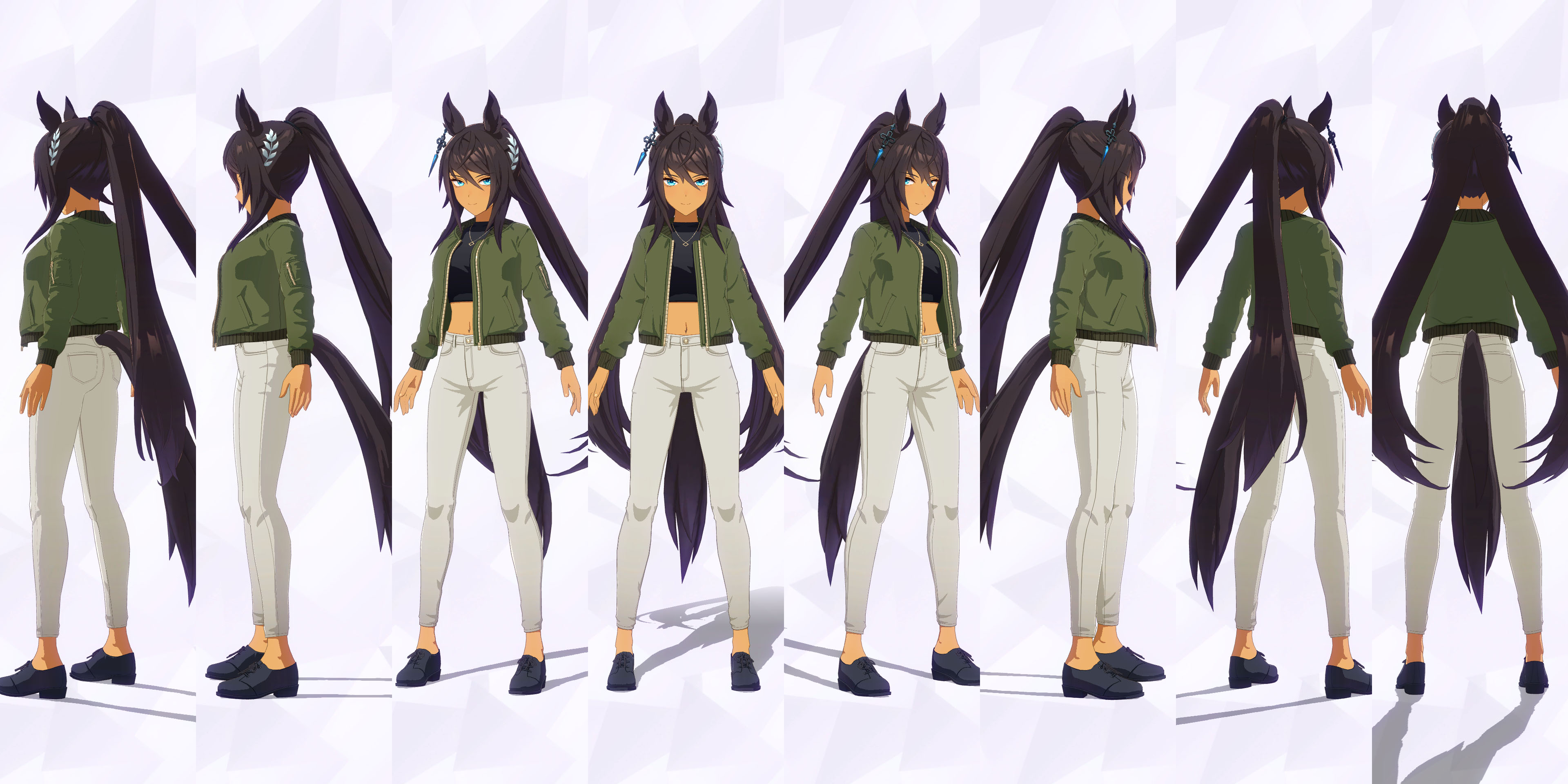 シンボリクリスエスの私服を入手しました(私服106着目)。クリスエスの私服は、黒のクロップド丈のインナーにアーミーグリーンのMA-1風ブルゾン、白に近い淡いグレーのスリムパンツ、黒のレースアップシューズ。クリスエスの話では、以前に破いたことがあり、それ以来力加減に注意しているそうです。