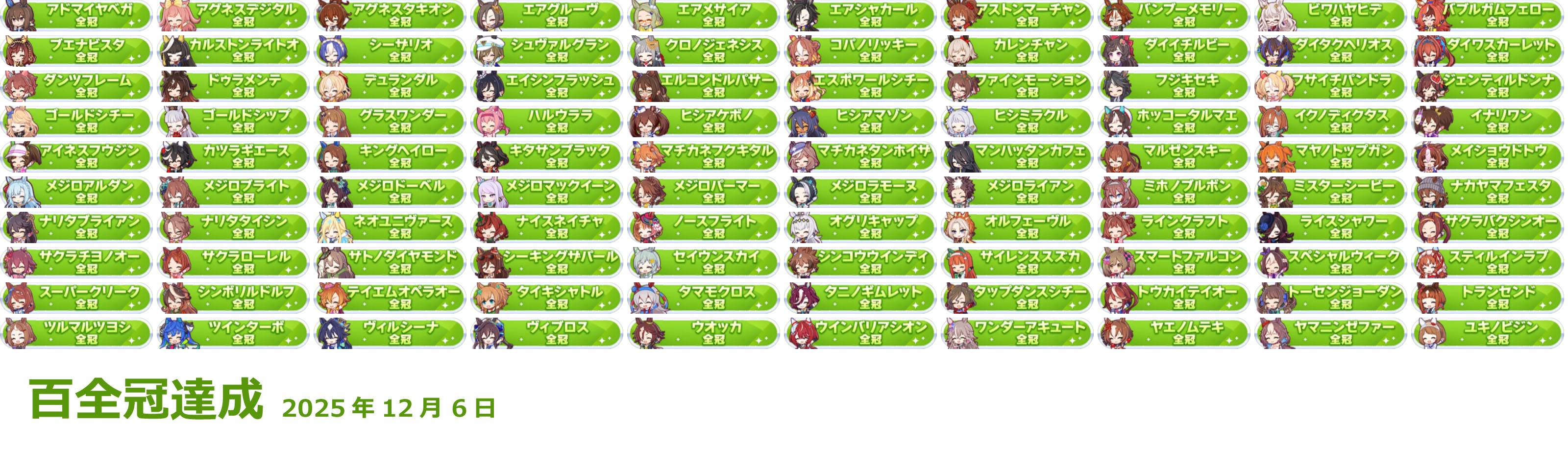 これで、テイオー、スズカ、タイキ、デジたん、カレン、オペ、フジ先輩、タイシン、シチー、ブライアンちゃん、ブライト、ヒシアマ姐さん、フラワー、ベル、スイーピー、ヤエノ、ウエディングマヤノ、バカンスタイキ、駿大祭タマちゃん、チヨちゃん、イナリ、パール、チアキング、グラサージュブルボン、アキュート、クリスエス、フェスタ、トライアンフファル子の計28人のウマ娘をピース150個でキャラ解放しました。次は、12月30日に振袖オペ、2月14日にウエディングカレン、3月24日にサンタスカーレットをピース解放する予定です。