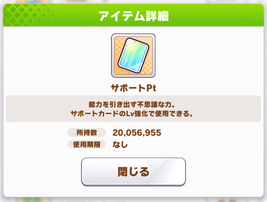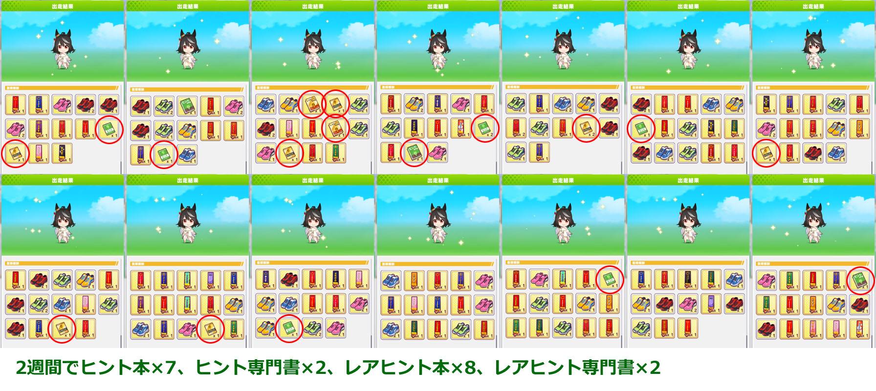 サポカ仕様変更に伴い追加されたデイリーレースのジュピターカップですが、2週間のドロップはヒント本×7、ヒント専門書×2、レアヒント本×8、レアヒント専門書×2でした。ドロップ率を測るにはまだまだ日数を要しますが、この 2週間はかなり運に左右されました。