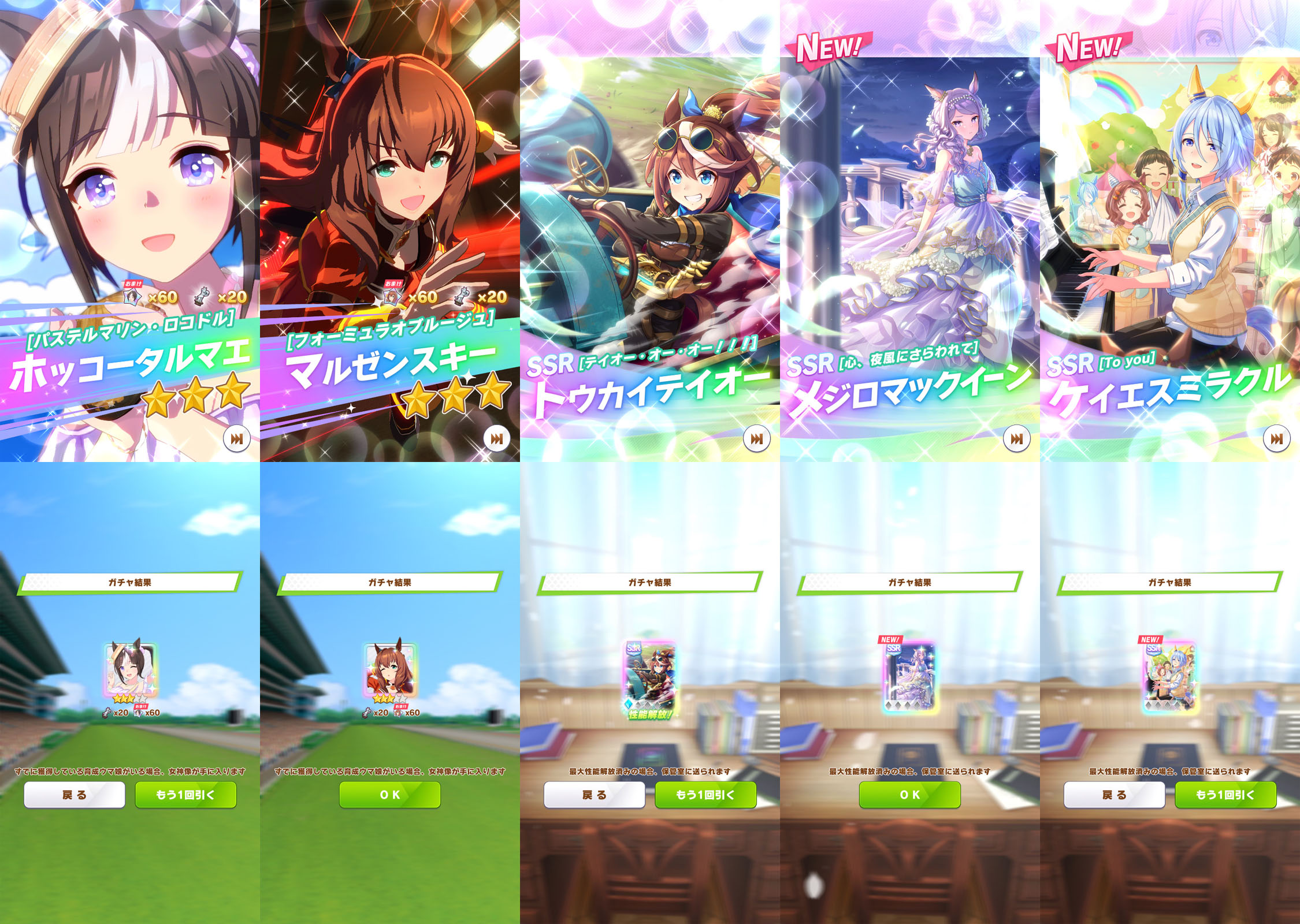 特別マニーショップで交換した確定ガチャチケットの結果は……残念。★3確定チケットは、バカンスタルマエとマルゼンスキーでどちらも被り、SSR確定チケットはSPテイオーと舞踏会マック、★2/SR確定チケットの虹昇格は保母ケイちゃんの 1枚のみ。バカンスタルマエが★4に才能開花できただけでも良しとします。