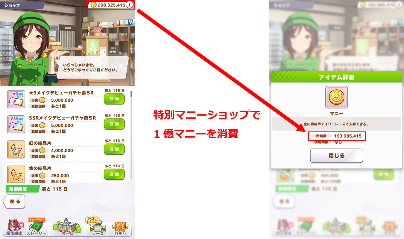 マニー残高が約 3億まで増えましたが、特別マニーショップで約 1億マニー分のアイテムと交換しました。タフネスとにんじんゼリーミニは最初の 2段階(200個)まで交換して止めました。金の結晶片は交換していません。