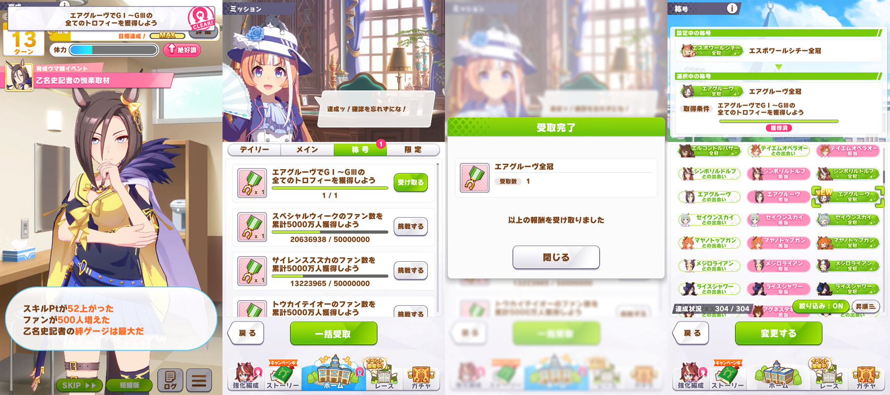 1女帝◯2伝説の証人◯3チームの絆◯4個人でもチームでも◯5アオハル魂爆発◯6時代を担う者◯7グッズパワー◯8クライマックス王者◯9勝利の栄光◯10伝説の再演◯11成功の立役者 ◯12King of Dance ◯13情熱ウマ娘 ◯14神の歌声 ◯15ビジュアル系 ◯16メンタリスト ◯17叡智の継承者 ◯18個性の継承者 ◯19想いの伝達者 20力の伝道者 21出藍の誉れ ◯22GM・チャンピオン ◯23磨き抜かれた素質 ◯24凱旋門賞ウマ娘◯25世界一の門を開く者◯26L'arc代表筆頭◯27課題克服◯28世界に橋を架ける者◯29最強アスリート◯30一流アスリート◯31マルチタレント◯32バーニングウマ娘◯33食と野菜の第一人者 34口福の立役者 35熟練農家ウマ娘 36にんじんマスター 37にんにくマスター 38じゃがいもマスター 39唐辛子マスター 40いちごマスター 41天才エンジニア◯42凄腕エンジニア◯43メカウマスター◯44オーバードライバー◯45未来へ繋ぐ伝説 46時代に輝く一番星 47大歓声を呼ぶ者 48揺るがぬ威光 49飽くなき挑戦者 50無敵の愛嬌 51無人島の開拓者◯52絆を束ねるウマ娘◯53スピード施設の匠◯54スタミナ施設の匠◯55パワー施設の匠 56根性施設の匠 57賢さ施設の匠 58海の家の匠 59湯けむりウマ娘◯60スポ根魂 61フィクサー 62次世代エンジン◯63マッスル万歳◯64ゴールデンブーツ◯65鋼のメンタル 66偉大なスプリンター◯67マイルの寵児◯68マイルの女王◯69無尽蔵のスタミナ◯70スキルマスター◯71技のデパート◯72時代の寵児◯73みんなのウマ娘◯74真・女王の精神◯75真・王者の精神◯76女王の精神◯77王者の精神◯78常勝ウマ娘◯79新時代の幕開け◯80レコードホルダー◯81GⅠハンター◯82唯一無二◯83伝説の歌姫◯84F・チャンピオン◯85レジェンドウマ娘◯86神速マイラー◯87高速マイラー◯88ベストウマ娘◯89ワンダフルウマ娘◯90ダートGⅠ覇者◯91クイーンウマ娘◯92プリンセスウマ娘◯93ダート達人◯94砂上の超越者◯95砂の寵児◯96チームの繋がり◯97切磋琢磨◯98稼ぎ頭◯99栄光への第一歩◯100歌唱上手 ◯101天性のパフォーマー ◯102受け継ぎし者 ◯103知識の収集者 ◯104StarS◯105海外レース博士◯106相談上手◯107リンクマスター◯108反抗期◯109突然変異◯110無敗の系譜◯111エリートウマ娘◯112パワフルウマ娘◯113超人ウマ娘 114自在ウマ娘◯115長短併せ呑む◯116オールラウンダー◯117二刀流◯118堅実派◯119スキルコレクター◯120闘魂◯121大井の帝王◯122スピードスター◯123浪花節◯124変則二冠ウマ娘◯125粗削りのマイル王◯126スピードクイーン◯127若きトップスタァ◯128アイアンウマ娘◯129完全無欠◯130春シニア三冠ウマ娘◯131秋シニア三冠ウマ娘◯132三冠ウマ娘◯133二冠ウマ娘◯134トリプルティアラ◯135ダブルティアラ◯136天皇賞春秋連覇◯137年末の覇者◯138グランプリ2世◯139シルバーコレクター 140芝の鬼◯141ターフの魔術師◯142横綱相撲◯143生粋のステイヤー◯144新世代の怪物◯145GⅠウマ娘◯146カリスマウマ娘◯147凄腕スプリンター◯148ダートGⅠ帝王◯149ダートGⅠ怪物◯150ダートGⅠ強者◯151ヒロインウマ娘◯152光速スプリンター◯153盾の覇者◯154春の覇者◯155秋の覇者◯156ダート玄人◯157ダート上手◯158根幹距離の覇者◯159非根幹距離の覇者◯160ダートスプリンター◯161可憐なウマ娘 162ダートの新星◯163ワールドウマ娘 164ジュニアウマ娘◯165名人ウマ娘 166達人ウマ娘◯167砂のスペシャリスト◯168川崎の鉄人◯169ナイトパレード◯170ノスタルジーウマ娘◯171ダートの鬼◯172砂のスピードスター◯173二つのバ場の女王◯174ダートマイルの勇者◯175地方の完全女傑 176食のサポーター 177シェフウマ娘 178メカギアコレクター◯179チューナーウマ娘◯180レジェンドの愛弟子 181心得の習熟者 182島トレ通のウマ娘◯183建設計画リーダー◯184名バを訪ねて 185直線番長 186全国区◯187ゴールドハンター◯188ジンクスブレイカー 189型破りウマ娘◯190ミス・ドルフィン 191鋼のフィジカル◯192努力の天才◯193クイズ王◯194お笑い継承◯195お似合い継承◯196豪脚ウマ娘◯197雪の女王◯198レイニーウマ娘◯199ミス・クラウディ◯200勝利への執念◯201ダート巧者◯202問答無用◯203ブロンズコレクター 204意外性◯205無冠の帝王 206瓢箪からウマ娘◯207菊花賞への想い◯208ダービーへの想い◯209皐月賞への想い◯210オークスへの想い◯211桜花賞への想い◯212伝説の始まり◯213仕上がりウマ娘◯214暴れん坊ウマ娘◯215出遅れの大器 216韋駄天走り◯217ダービーウマ娘◯218オークスウマ娘◯219伏兵◯220ワイドなウマ娘◯221連勝ウマ娘◯222安定感◯223第六感の持ち主◯224ミス・オールダート 225ミス・オールターフ◯226台風の目◯227GⅡウマ娘◯228重賞ウマ娘◯229メイクデビュー◯230ベテランウマ娘◯231北海道マスター◯232東北マスター◯233関東マスター◯234西日本マスター◯235小倉マスター◯236地方巡りの旅◯237地方観光◯238レイトショー◯239夕焼けのウマ娘◯240地方で名バを訪ねて
