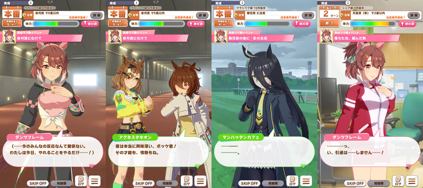 ダンツフレームの育成ストーリーは、2001年クラシック三強、安田宝塚ローテ、ダート転向の 3つのテーマを中心に描かれています。古馬戦は史実をベースにした時系列が異なるifストーリーです。皐月賞のタキオンとダービーのポッケが強敵ですが、菊花賞のカフェは長距離適性を上げれば勝てます。