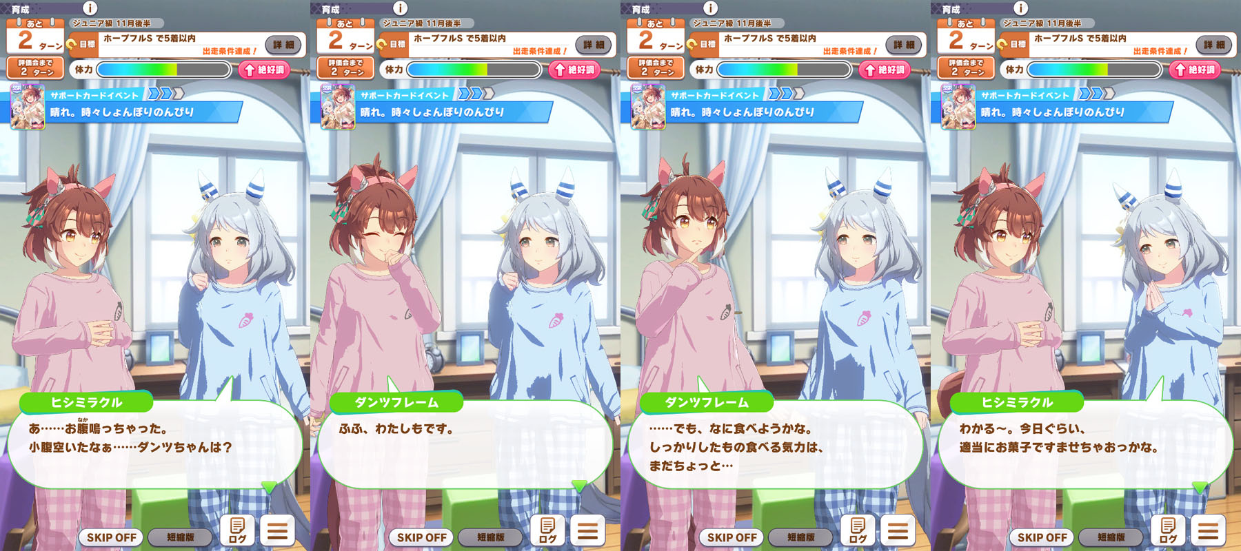 ダンツフレームのチーム競技場掛け合いボイスは、同世代でレースでも対戦しているジャングルポケットと同じく史実で対戦しているヒシミラクルの 2人です。ポッケは未所持です。