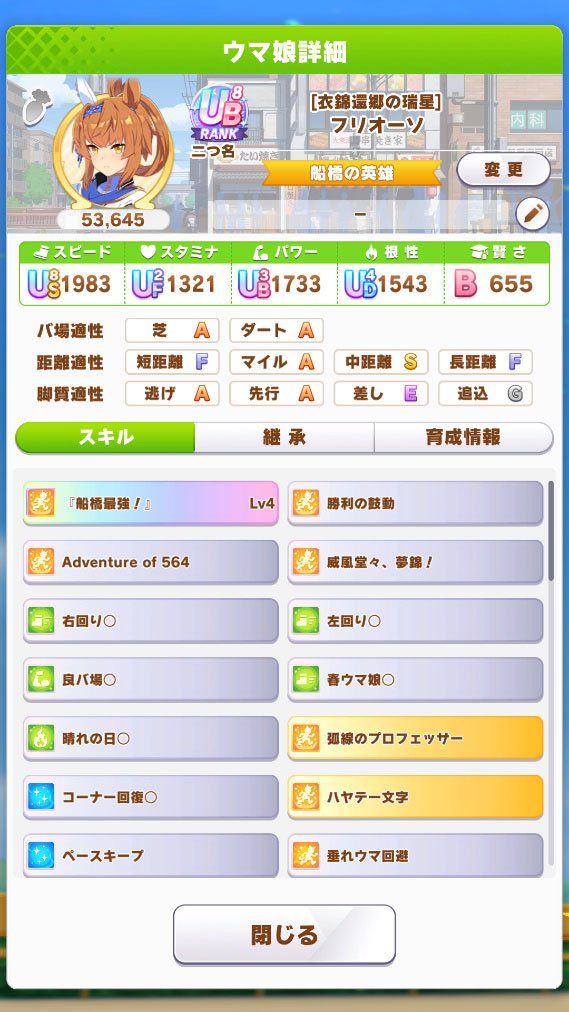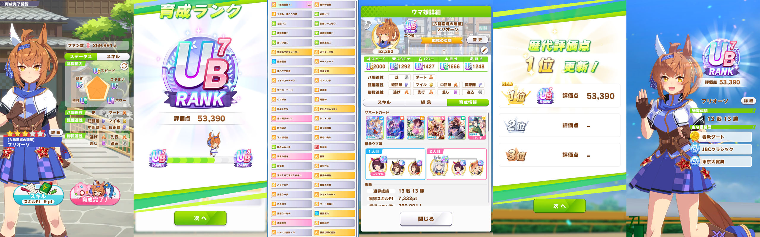 フリオーソの初回育成結果は、ランクUB7でした。マイル適正がSになり、サポカも全て完走したため、初回育成としては満足できる結果です。とりあえず、このフリオをチムレに出走させて親愛度を稼ぎます。