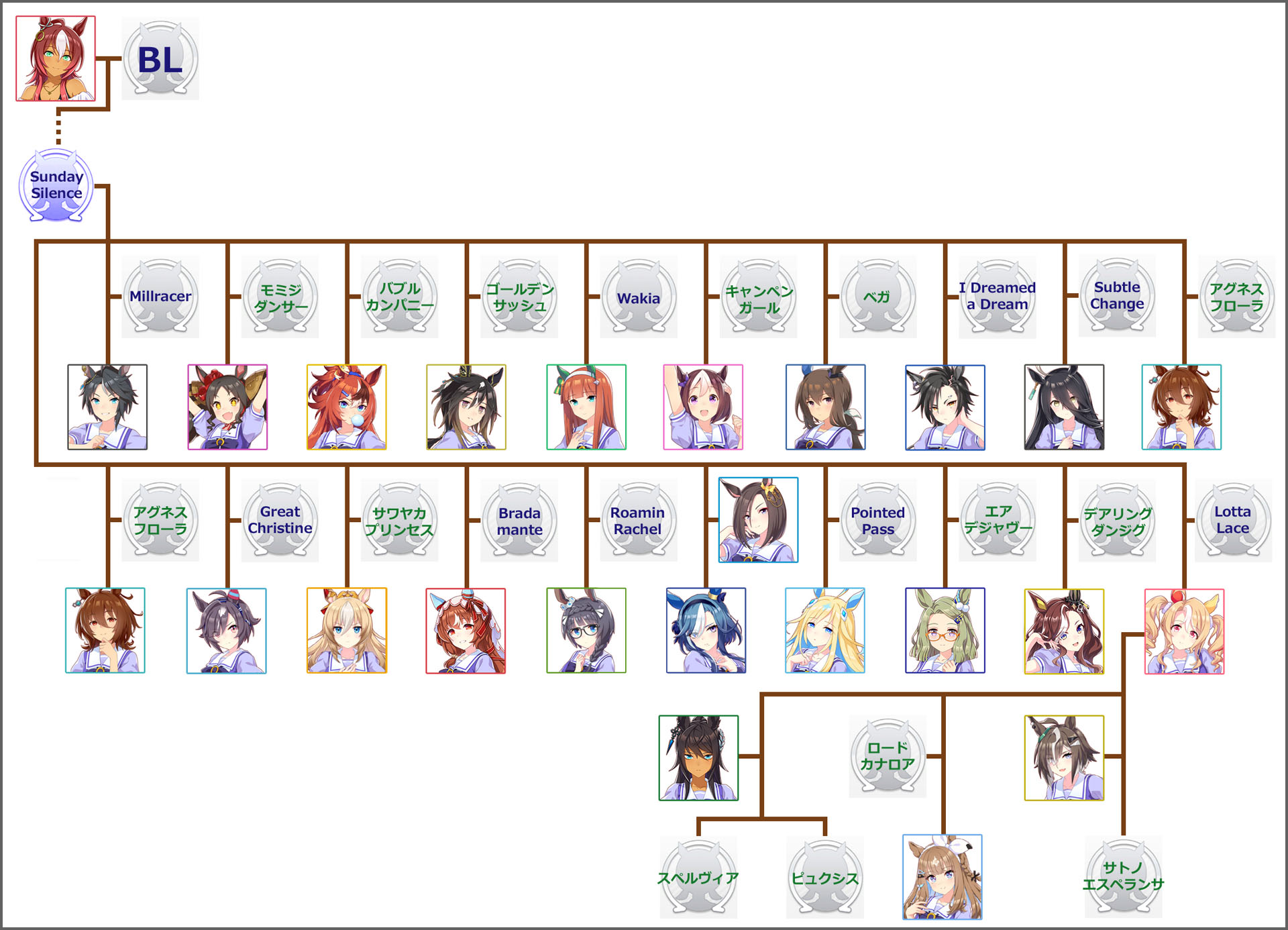 モチーフ馬のフサイチパンドラは、ダーレーアラビアン系の26世代目です。Sunday Silence産駒は、フジキセキ、マーベラスサンデー、バブルガムフェロー、ステイゴールド、サイレンススズカ、スペシャルウィーク、アドマイヤベガ、エアシャカール、マンハッタンカフェ、アグネスタキオン、ビリーヴ、スティルインラブ、ゼンノロブロイ、ネオユニヴァース、エアメサイア、デアリングハート、デュランダル、フサイチパンドラの18人のウマ娘がいます。この辺りの話は、マンハッタンカフェの育成ストーリーとして実装されています。フサイチパンドラ産駒と言えば、もちろん牝馬三冠のアーモンドアイが有名ですが、他にもシンボリクリスエス産駒のスペルヴィア(初仔)とピュクシス、ルーラーシップ産駒のサトノエスペランサがいます。