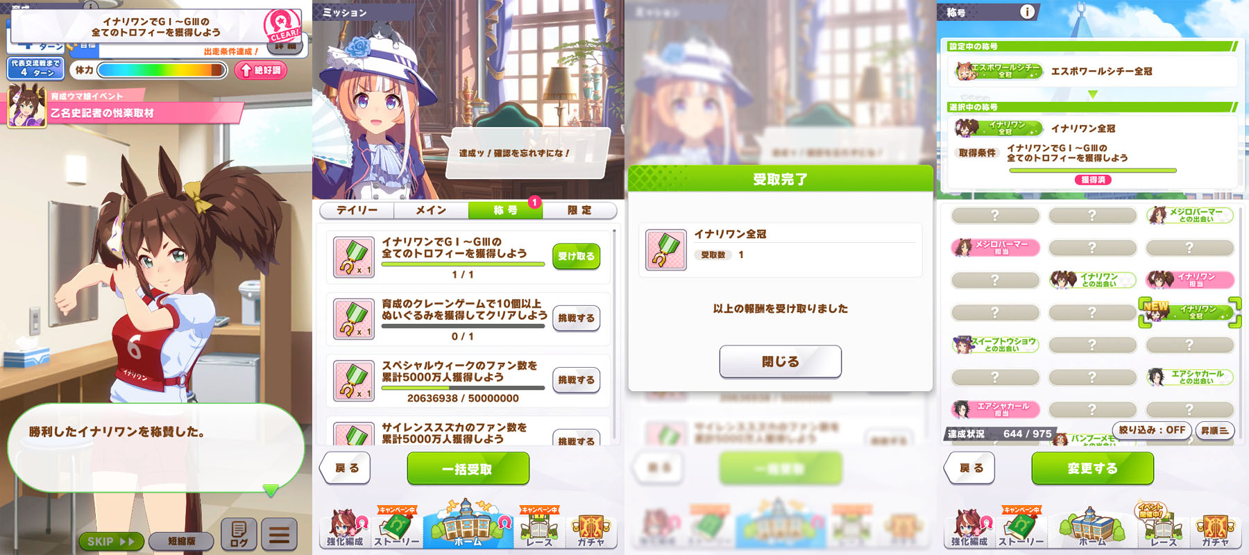 1大井から来た天下人◯2伝説の証人 3チームの絆 4個人でもチームでも 5アオハル魂爆発 6時代を担う者◯7グッズパワー◯8クライマックス王者◯9勝利の栄光◯10伝説の再演 11成功の立役者 12King of Dance 13情熱ウマ娘 14神の歌声 15ビジュアル系 16メンタリスト 17叡智の継承者 18個性の継承者 19想いの伝達者 20力の伝道者 21出藍の誉れ 22GM・チャンピオン 23磨き抜かれた素質 24凱旋門賞ウマ娘◯25世界一の門を開く者◯26L'arc代表筆頭◯27課題克服◯28世界に橋を架ける者◯29最強アスリート 30一流アスリート 31マルチタレント 32バーニングウマ娘 33食と野菜の第一人者 34口福の立役者 35熟練農家ウマ娘 36にんじんマスター 37にんにくマスター 38じゃがいもマスター 39唐辛子マスター 40いちごマスター 41天才エンジニア 42凄腕エンジニア 43メカウマスター 44オーバードライバー 45未来へ繋ぐ伝説◯46時代に輝く一番星 47大歓声を呼ぶ者◯48揺るがぬ威光 49飽くなき挑戦者 50無敵の愛嬌◯51無人島の開拓者◯52絆を束ねるウマ娘◯53スピード施設の匠◯54スタミナ施設の匠◯55パワー施設の匠 56根性施設の匠 57賢さ施設の匠 58海の家の匠 59湯けむりウマ娘◯60スポ根魂◯61フィクサー◯62次世代エンジン◯63マッスル万歳◯64ゴールデンブーツ◯65鋼のメンタル 66偉大なスプリンター◯67マイルの寵児 68マイルの女王◯69無尽蔵のスタミナ◯70スキルマスター◯71技のデパート◯72時代の寵児◯73みんなのウマ娘◯74真・女王の精神◯75真・王者の精神◯76女王の精神◯77王者の精神◯78常勝ウマ娘◯79新時代の幕開け◯80レコードホルダー◯81GⅠハンター◯82唯一無二◯83伝説の歌姫◯84F・チャンピオン◯85レジェンドウマ娘 86神速マイラー 87高速マイラー◯88ベストウマ娘 89ワンダフルウマ娘 90ダートGⅠ覇者 91クイーンウマ娘 92プリンセスウマ娘◯93ダート達人 94砂上の超越者 95砂の寵児◯96チームの繋がり 97切磋琢磨 98稼ぎ頭◯99栄光への第一歩◯100歌唱上手 101天性のパフォーマー 102受け継ぎし者 103知識の収集者 104StarS◯105海外レース博士◯106相談上手 107リンクマスター 108反抗期 109突然変異◯110無敗の系譜◯111エリートウマ娘◯112パワフルウマ娘◯113超人ウマ娘◯114自在ウマ娘◯115長短併せ呑む◯116オールラウンダー◯117二刀流◯118堅実派◯119スキルコレクター◯120闘魂 121大井の帝王 122スピードスター◯123浪花節 124変則二冠ウマ娘◯125粗削りのマイル王◯126スピードクイーン◯127若きトップスタァ◯128アイアンウマ娘◯129完全無欠◯130春シニア三冠ウマ娘◯131秋シニア三冠ウマ娘◯132三冠ウマ娘◯133二冠ウマ娘◯134トリプルティアラ◯135ダブルティアラ◯136天皇賞春秋連覇◯137年末の覇者 138グランプリ2世◯139シルバーコレクター 140芝の鬼◯141ターフの魔術師◯142横綱相撲◯143生粋のステイヤー◯144新世代の怪物◯145GⅠウマ娘◯146カリスマウマ娘 147凄腕スプリンター◯148ダートGⅠ帝王◯149ダートGⅠ怪物◯150ダートGⅠ強者◯151ヒロインウマ娘◯152光速スプリンター◯153盾の覇者 154春の覇者 155秋の覇者◯156ダート玄人 157ダート上手◯158根幹距離の覇者◯159非根幹距離の覇者◯160ダートスプリンター 161可憐なウマ娘 162ダートの新星 163ワールドウマ娘 164ジュニアウマ娘◯165名人ウマ娘◯166達人ウマ娘 167砂のスペシャリスト 168川崎の鉄人 169ナイトパレード 170ノスタルジーウマ娘 171ダートの鬼◯172砂のスピードスター 173二つのバ場の女王◯174ダートマイルの勇者◯175地方の完全女傑 176食のサポーター 177シェフウマ娘 178メカギアコレクター 179チューナーウマ娘 180レジェンドの愛弟子◯181心得の習熟者◯182島トレ通のウマ娘◯183建設計画リーダー◯184名バを訪ねて◯185直線番長 186全国区◯187ゴールドハンター◯188ジンクスブレイカー◯189型破りウマ娘 190ミス・ドルフィン 191鋼のフィジカル◯192努力の天才◯193クイズ王◯194お笑い継承 195お似合い継承◯196豪脚ウマ娘◯197雪の女王 198レイニーウマ娘◯199ミス・クラウディ◯200勝利への執念 201ダート巧者◯202問答無用◯203ブロンズコレクター 204意外性◯205無冠の帝王 206瓢箪からウマ娘◯207菊花賞への想い◯208ダービーへの想い◯209皐月賞への想い◯210オークスへの想い◯211桜花賞への想い◯212伝説の始まり◯213仕上がりウマ娘◯214暴れん坊ウマ娘◯215出遅れの大器 216韋駄天走り 217ダービーウマ娘◯218オークスウマ娘◯219伏兵 220ワイドなウマ娘◯221連勝ウマ娘◯222安定感◯223第六感の持ち主◯224ミス・オールダート 225ミス・オールターフ 226台風の目◯227GⅡウマ娘◯228重賞ウマ娘◯229メイクデビュー◯230ベテランウマ娘◯231北海道マスター◯232東北マスター◯233関東マスター◯234西日本マスター◯235小倉マスター◯236地方巡りの旅◯237地方観光◯238レイトショー◯239夕焼けのウマ娘◯240地方で名バを訪ねて