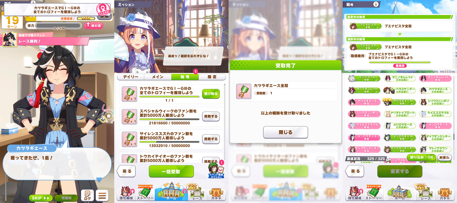 1登竜之頂◯2伝説の証人 3チームの絆 4個人でもチームでも 5アオハル魂爆発 6時代を担う者◯7グッズパワー◯8クライマックス王者◯9勝利の栄光◯10伝説の再演 11成功の立役者 12King of Dance 13情熱ウマ娘 14神の歌声 15ビジュアル系 16メンタリスト 17叡智の継承者 18個性の継承者 19想いの伝達者 20力の伝道者 21出藍の誉れ 22GM・チャンピオン 23磨き抜かれた素質 24凱旋門賞ウマ娘◯25世界一の門を開く者◯26L'arc代表筆頭◯27課題克服◯28世界に橋を架ける者◯29最強アスリート 30一流アスリート 31マルチタレント 32バーニングウマ娘 33食と野菜の第一人者 34口福の立役者 35熟練農家ウマ娘 36にんじんマスター 37にんにくマスター 38じゃがいもマスター 39唐辛子マスター 40いちごマスター 41天才エンジニア 42凄腕エンジニア 43メカウマスター 44オーバードライバー 45未来へ繋ぐ伝説◯46時代に輝く一番星◯47大歓声を呼ぶ者◯48揺るがぬ威光 49飽くなき挑戦者 50無敵の愛嬌◯51無人島の開拓者◯52絆を束ねるウマ娘◯53スピード施設の匠◯54スタミナ施設の匠◯55パワー施設の匠 56根性施設の匠 57賢さ施設の匠 58海の家の匠 59至福のひととき◯60秘湯伝説の探究者◯61掘削職人◯62湧き出る活力 63湯けむりウマ娘◯64スポ根魂◯65フィクサー◯66次世代エンジン◯67マッスル万歳◯68ゴールデンブーツ◯69鋼のメンタル 70偉大なスプリンター◯71マイルの寵児◯72マイルの女王◯73無尽蔵のスタミナ◯74スキルマスター◯75技のデパート◯76時代の寵児◯77みんなのウマ娘◯78真・女王の精神◯79真・王者の精神◯80女王の精神◯81王者の精神◯82常勝ウマ娘◯83新時代の幕開け◯84レコードホルダー◯85GⅠハンター◯86唯一無二◯87伝説の歌姫◯88F・チャンピオン◯89レジェンドウマ娘 90神速マイラー◯91高速マイラー◯92ベストウマ娘 93ワンダフルウマ娘 94ダートGⅠ覇者◯95クイーンウマ娘◯96プリンセスウマ娘◯97ダート達人◯98砂上の超越者◯99砂の寵児◯100チームの繋がり 101切磋琢磨 102稼ぎ頭◯103栄光への第一歩◯104歌唱上手 105天性のパフォーマー 106受け継ぎし者 107知識の収集者 108StarS◯109海外レース博士◯110相談上手 111リンクマスター 112反抗期 113突然変異 114無敗の系譜◯115エリートウマ娘◯116パワフルウマ娘◯117超人ウマ娘◯118自在ウマ娘◯119長短併せ呑む◯120オールラウンダー◯121二刀流◯122堅実派◯123スキルコレクター◯124闘魂◯125大井の帝王◯126スピードスター◯127浪花節 128変則二冠ウマ娘◯129粗削りのマイル王◯130スピードクイーン◯131若きトップスタァ◯132アイアンウマ娘◯133完全無欠◯134春シニア三冠ウマ娘◯135秋シニア三冠ウマ娘◯136三冠ウマ娘◯137二冠ウマ娘◯138トリプルティアラ◯139ダブルティアラ◯140天皇賞春秋連覇◯141年末の覇者◯142グランプリ2世◯143シルバーコレクター 144芝の鬼◯145ターフの魔術師◯146横綱相撲◯147生粋のステイヤー◯148新世代の怪物◯149GⅠウマ娘◯150カリスマウマ娘 151凄腕スプリンター◯152ダートGⅠ帝王◯153ダートGⅠ怪物◯154ダートGⅠ強者◯155ヒロインウマ娘◯156光速スプリンター◯157盾の覇者◯158春の覇者 159秋の覇者◯160ダート玄人◯161ダート上手◯162根幹距離の覇者◯163非根幹距離の覇者◯164ダートスプリンター 165可憐なウマ娘◯166ダートの新星 167ワールドウマ娘◯168ジュニアウマ娘◯169名人ウマ娘◯170達人ウマ娘 171砂のスペシャリスト◯172川崎の鉄人◯173ナイトパレード◯174ノスタルジーウマ娘◯175ダートの鬼◯176砂のスピードスター◯177二つのバ場の女王 178ダートマイルの勇者◯179地方の完全女傑 180食のサポーター 181シェフウマ娘 182メカギアコレクター 183チューナーウマ娘 184レジェンドの愛弟子◯185心得の習熟者 186島トレ通のウマ娘◯187建設計画リーダー◯188温泉マニア◯189温泉郷アンバサダー 190名バを訪ねて 191直線番長 192全国区◯193ゴールドハンター◯194ジンクスブレイカー◯195型破りウマ娘 196ミス・ドルフィン 197鋼のフィジカル◯198努力の天才◯199クイズ王◯200お笑い継承 201お似合い継承◯202豪脚ウマ娘◯203雪の女王 204レイニーウマ娘◯205ミス・クラウディ◯206勝利への執念 207ダート巧者◯208問答無用◯209ブロンズコレクター 210意外性◯211無冠の帝王 212瓢箪からウマ娘 213菊花賞への想い◯214ダービーへの想い◯215皐月賞への想い◯216オークスへの想い◯217桜花賞への想い◯218伝説の始まり◯219仕上がりウマ娘 220暴れん坊ウマ娘◯221出遅れの大器 222韋駄天走り◯223ダービーウマ娘◯224オークスウマ娘◯225伏兵 226ワイドなウマ娘◯227連勝ウマ娘◯228安定感◯229第六感の持ち主◯230ミス・オールダート 231ミス・オールターフ◯232台風の目◯233GⅡウマ娘◯234重賞ウマ娘◯235メイクデビュー◯236ベテランウマ娘◯237北海道マスター◯238東北マスター◯239関東マスター◯240西日本マスター◯241小倉マスター◯242地方巡りの旅◯243地方観光◯244レイトショー◯245夕焼けのウマ娘◯246地方で名バを訪ねて