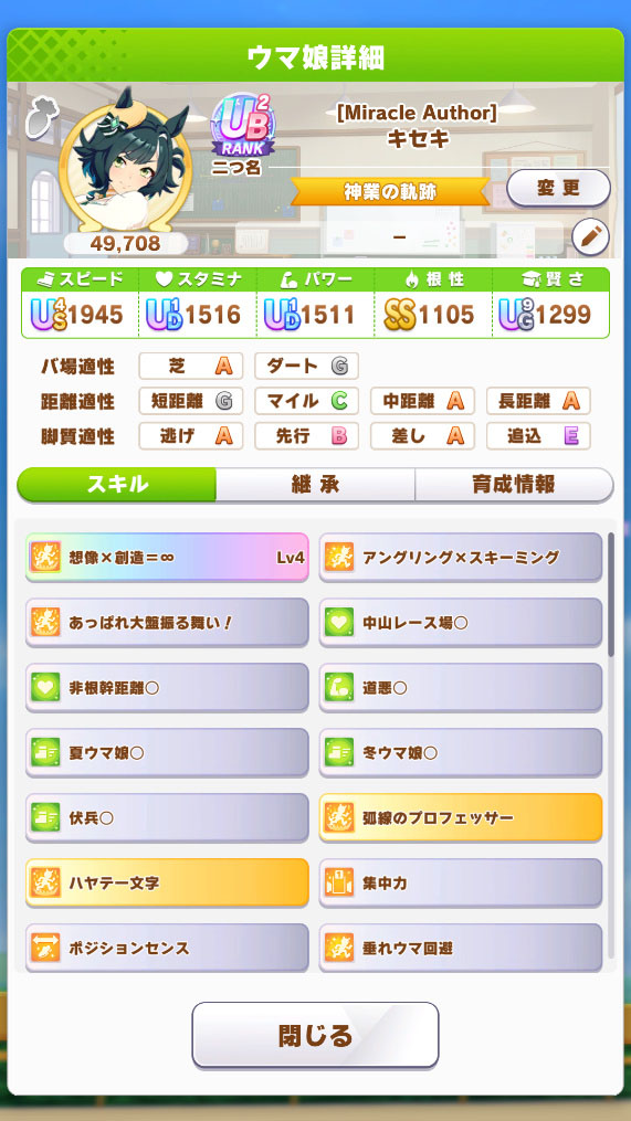 キセキの初回育成結果は、ランクUB2でした。残念ながらスピード不足の下振れです。チムレで親愛度を稼ぐにしても、このステータスでは厳しいため、すぐに再育成します。ちなみに、初回育成時はアイちゃんに負けました。