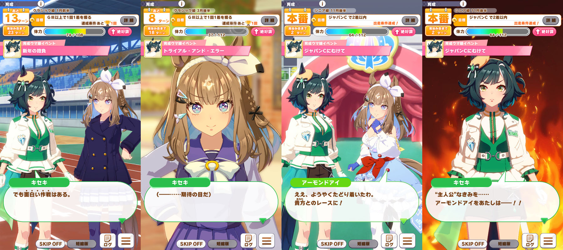 キセキの育成ストーリーは、「面白いレース(二刀流の脚質)」、「アーモンドアイ(主人公)」の 2つのテーマを中心に描かれています。作中のキセキは、史実通り逃げと差しの二つの脚質を活かしてわくわくする面白いレースを目指します。そして、アーモンドアイは、史実通り最強のライバルとして立ちはだかります。