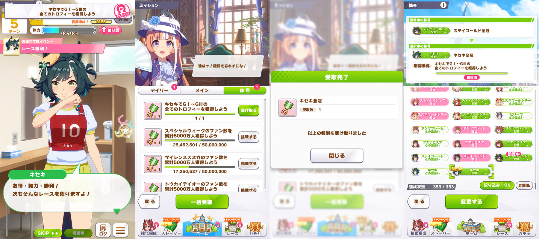 1神業の軌跡◯2伝説の証人 3チームの絆 4個人でもチームでも 5アオハル魂爆発 6時代を担う者◯7グッズパワー◯8クライマックス王者◯9勝利の栄光◯10伝説の再演 11成功の立役者 12King of Dance 13情熱ウマ娘 14神の歌声 15ビジュアル系 16メンタリスト 17叡智の継承者 18個性の継承者 19想いの伝達者 20力の伝道者 21出藍の誉れ 22GM・チャンピオン 23磨き抜かれた素質 24凱旋門賞ウマ娘◯25世界一の門を開く者◯26L'arc代表筆頭◯27課題克服◯28世界に橋を架ける者◯29最強アスリート 30一流アスリート 31マルチタレント 32バーニングウマ娘 33食と野菜の第一人者 34口福の立役者 35熟練農家ウマ娘 36にんじんマスター 37にんにくマスター 38じゃがいもマスター 39唐辛子マスター 40いちごマスター 41天才エンジニア 42凄腕エンジニア 43メカウマスター 44オーバードライバー 45未来へ繋ぐ伝説 46時代に輝く一番星 47大歓声を呼ぶ者 48揺るがぬ威光 49飽くなき挑戦者 50無敵の愛嬌 51無人島の開拓者◯52絆を束ねるウマ娘 53スピード施設の匠◯54スタミナ施設の匠◯55パワー施設の匠◯56根性施設の匠◯57賢さ施設の匠 58海の家の匠◯59至福のひととき◯60秘湯伝説の探究者◯61掘削職人◯62湧き出る活力◯63湯けむりウマ娘 64スポ根魂 65フィクサー 66次世代エンジン◯67マッスル万歳◯68ゴールデンブーツ◯69鋼のメンタル 70偉大なスプリンター◯71マイルの寵児◯72マイルの女王◯73無尽蔵のスタミナ◯74スキルマスター◯75技のデパート◯76時代の寵児◯77みんなのウマ娘◯78真・女王の精神◯79真・王者の精神◯80女王の精神◯81王者の精神◯82常勝ウマ娘◯83新時代の幕開け◯84レコードホルダー◯85GⅠハンター◯86唯一無二◯87伝説の歌姫◯88F・チャンピオン◯89レジェンドウマ娘 90神速マイラー 91高速マイラー◯92ベストウマ娘 93ワンダフルウマ娘 94ダートGⅠ覇者◯95クイーンウマ娘 96プリンセスウマ娘◯97ダート達人 98砂上の超越者 99砂の寵児◯100チームの繋がり 101切磋琢磨 102稼ぎ頭◯103栄光への第一歩◯104歌唱上手 105天性のパフォーマー 106受け継ぎし者 107知識の収集者 108StarS◯109海外レース博士◯110相談上手 111リンクマスター 112反抗期 113突然変異◯114無敗の系譜◯115エリートウマ娘◯116パワフルウマ娘◯117超人ウマ娘◯118自在ウマ娘◯119長短併せ呑む◯120オールラウンダー◯121二刀流◯122堅実派◯123スキルコレクター◯124闘魂◯125大井の帝王◯126スピードスター◯127浪花節◯128変則二冠ウマ娘◯129粗削りのマイル王◯130スピードクイーン◯131若きトップスタァ◯132アイアンウマ娘◯133完全無欠◯134春シニア三冠ウマ娘◯135秋シニア三冠ウマ娘◯136三冠ウマ娘◯137二冠ウマ娘◯138トリプルティアラ◯139ダブルティアラ◯140天皇賞春秋連覇◯141年末の覇者◯142グランプリ2世◯143シルバーコレクター 144芝の鬼◯145ターフの魔術師◯146横綱相撲◯147生粋のステイヤー◯148新世代の怪物◯149GⅠウマ娘◯150カリスマウマ娘 151凄腕スプリンター 152ダートGⅠ帝王◯153ダートGⅠ怪物◯154ダートGⅠ強者◯155ヒロインウマ娘◯156光速スプリンター 157盾の覇者 158春の覇者 159秋の覇者 160ダート玄人◯161ダート上手◯162根幹距離の覇者◯163非根幹距離の覇者◯164ダートスプリンター 165可憐なウマ娘 166ダートの新星 167ワールドウマ娘◯168ジュニアウマ娘 169名人ウマ娘 170達人ウマ娘 171砂のスペシャリスト◯172川崎の鉄人◯173ナイトパレード◯174ノスタルジーウマ娘◯175ダートの鬼◯176砂のスピードスター◯177二つのバ場の女王◯178ダートマイルの勇者◯179地方の完全女傑◯180食のサポーター 181シェフウマ娘 182メカギアコレクター 183チューナーウマ娘 184レジェンドの愛弟子 185心得の習熟者 186島トレ通のウマ娘 187建設計画リーダー◯188温泉マニア◯189温泉郷アンバサダー◯190名バを訪ねて◯191直線番長 192全国区◯193ゴールドハンター◯194ジンクスブレイカー◯195型破りウマ娘 196ミス・ドルフィン 197鋼のフィジカル◯198努力の天才◯199クイズ王◯200お笑い継承 201お似合い継承◯202豪脚ウマ娘◯203雪の女王◯204レイニーウマ娘◯205ミス・クラウディ◯206勝利への執念 207ダート巧者◯208問答無用◯209ブロンズコレクター 210意外性◯211無冠の帝王 212瓢箪からウマ娘◯213菊花賞への想い◯214ダービーへの想い◯215皐月賞への想い◯216オークスへの想い◯217桜花賞への想い◯218伝説の始まり◯219仕上がりウマ娘◯220暴れん坊ウマ娘◯221出遅れの大器 222韋駄天走り◯223ダービーウマ娘◯224オークスウマ娘◯225伏兵 226ワイドなウマ娘◯227連勝ウマ娘◯228安定感◯229第六感の持ち主◯230ミス・オールダート 231ミス・オールターフ◯232台風の目◯233GⅡウマ娘◯234重賞ウマ娘◯235メイクデビュー◯236ベテランウマ娘◯237北海道マスター◯238東北マスター 239関東マスター◯240西日本マスター◯241小倉マスター 242地方巡りの旅◯243地方観光◯244レイトショー◯245夕焼けのウマ娘◯246地方で名バを訪ねて◯
