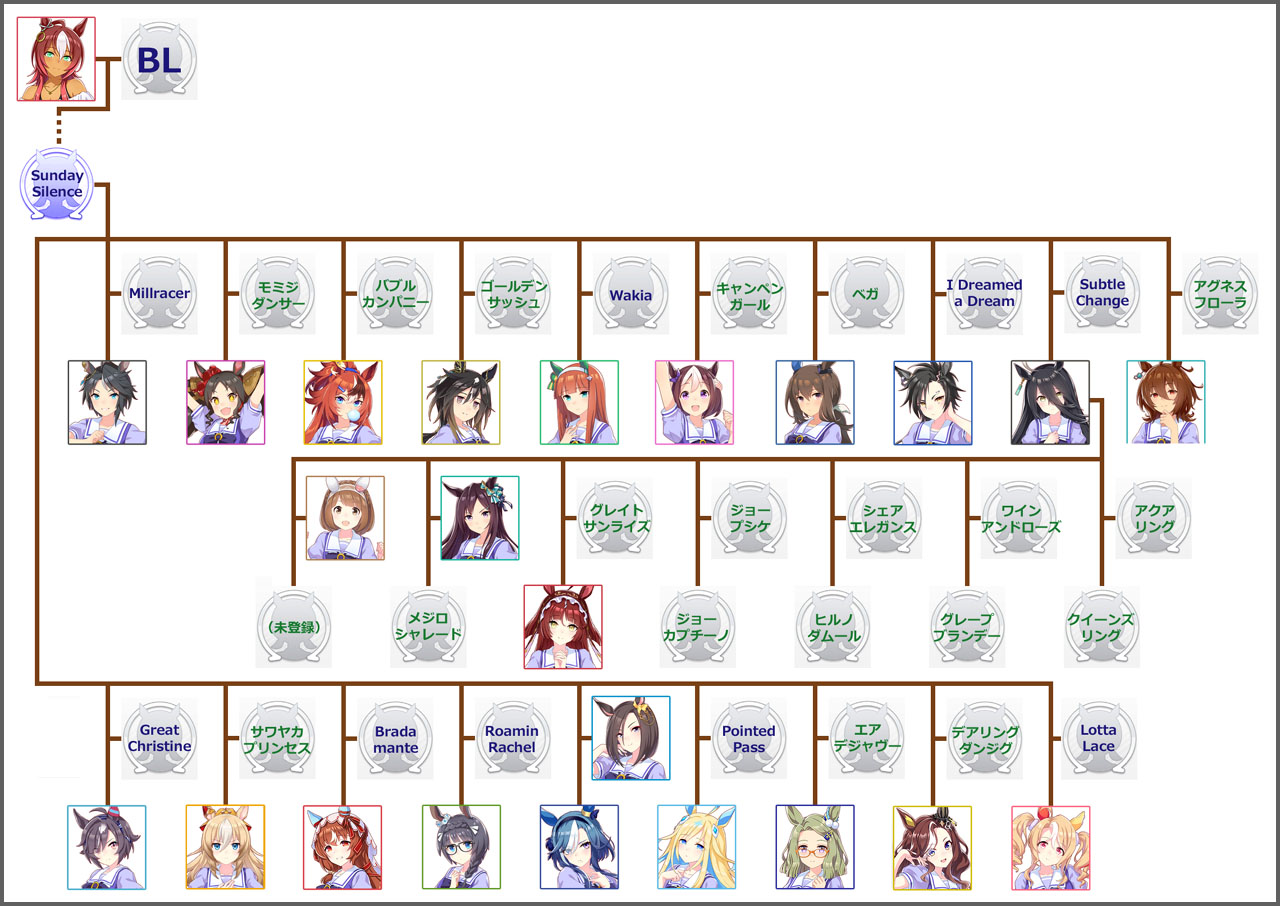 モチーフ馬のマンハッタンカフェは、ダーレーアラビアン系の25世代目です。Sunday Silence産駒は、フジキセキ、マーベラスサンデー、バブルガムフェロー、ステイゴールド、サイレンススズカ、スペシャルウィーク、アドマイヤベガ、エアシャカール、マンハッタンカフェ、アグネスタキオン、ビリーヴ、スティルインラブ、ゼンノロブロイ、ネオユニヴァース、エアメサイア、デアリングハート、デュランダル、フサイチパンドラの18人のウマ娘がいます。この辺りの話は、後述の育成ストーリーの中で語られています。マンハッタンカフェ産駒には、レッドディザイア、ジョーカプチーノ、ヒルノダムール、グレープブランデー、クイーンズリングの 5頭のGⅠ馬がいます。ヒルノダムールは、エイシンフラッシュが 2着で敗れた春天の勝馬です。また、メジロドーベルの子にメジロシャレードがいます。ユキノビジンの子は、競走馬登録されていません。