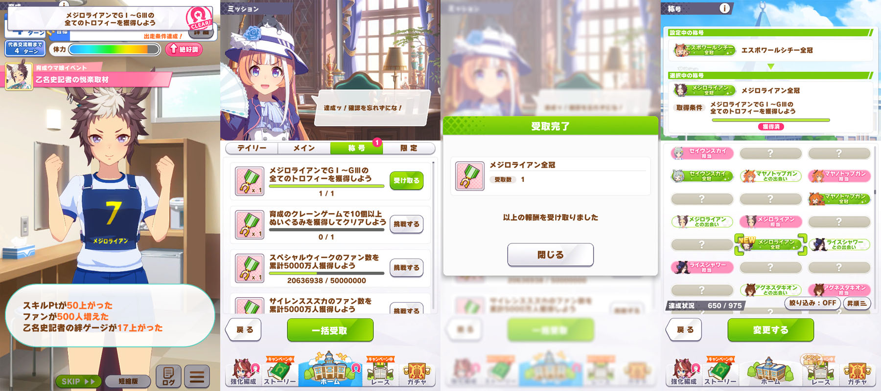 1麗しき実力者◯2伝説の証人◯3チームの絆◯4個人でもチームでも◯5アオハル魂爆発◯6時代を担う者◯7グッズパワー◯8クライマックス王者◯9勝利の栄光 10伝説の再演◯11成功の立役者 ◯12King of Dance ◯13情熱ウマ娘 ◯14神の歌声 ◯15ビジュアル系 ◯16メンタリスト ◯17叡智の継承者 ◯18個性の継承者 19想いの伝達者 20力の伝道者 ◯21出藍の誉れ ◯22GM・チャンピオン ◯23磨き抜かれた素質 ◯24凱旋門賞ウマ娘◯25世界一の門を開く者◯26L'arc代表筆頭◯27課題克服◯28世界に橋を架ける者◯29最強アスリート◯30一流アスリート◯31マルチタレント◯32バーニングウマ娘◯33食と野菜の第一人者◯34口福の立役者◯35熟練農家ウマ娘◯36にんじんマスター◯37にんにくマスター◯38じゃがいもマスター◯39唐辛子マスター◯40いちごマスター◯41天才エンジニア◯42凄腕エンジニア◯43メカウマスター◯44オーバードライバー◯45未来へ繋ぐ伝説 46時代に輝く一番星 47大歓声を呼ぶ者 48揺るがぬ威光 49飽くなき挑戦者 50無敵の愛嬌 51無人島の開拓者◯52絆を束ねるウマ娘 53スピード施設の匠◯54スタミナ施設の匠◯55パワー施設の匠◯56根性施設の匠 57賢さ施設の匠 58海の家の匠 59湯けむりウマ娘◯60スポ根魂 61フィクサー◯62次世代エンジン◯63マッスル万歳◯64ゴールデンブーツ◯65鋼のメンタル 66偉大なスプリンター◯67マイルの寵児◯68マイルの女王◯69無尽蔵のスタミナ◯70スキルマスター◯71技のデパート◯72時代の寵児◯73みんなのウマ娘◯74真・女王の精神 75真・王者の精神◯76女王の精神◯77王者の精神◯78常勝ウマ娘◯79新時代の幕開け◯80レコードホルダー◯81GⅠハンター◯82唯一無二◯83伝説の歌姫◯84F・チャンピオン◯85レジェンドウマ娘 86神速マイラー◯87高速マイラー◯88ベストウマ娘 89ワンダフルウマ娘 90ダートGⅠ覇者 91クイーンウマ娘◯92プリンセスウマ娘◯93ダート達人 94砂上の超越者 95砂の寵児◯96チームの繋がり◯97切磋琢磨◯98稼ぎ頭◯99栄光への第一歩◯100歌唱上手 ◯101天性のパフォーマー ◯102受け継ぎし者 ◯103知識の収集者 ◯104StarS◯105海外レース博士◯106相談上手◯107リンクマスター◯108反抗期◯109突然変異 110無敗の系譜◯111エリートウマ娘◯112パワフルウマ娘◯113超人ウマ娘◯114自在ウマ娘◯115長短併せ呑む◯116オールラウンダー◯117二刀流◯118堅実派◯119スキルコレクター◯120闘魂◯121大井の帝王◯122スピードスター◯123浪花節◯124変則二冠ウマ娘◯125粗削りのマイル王◯126スピードクイーン◯127若きトップスタァ◯128アイアンウマ娘◯129完全無欠◯130春シニア三冠ウマ娘◯131秋シニア三冠ウマ娘◯132三冠ウマ娘◯133二冠ウマ娘◯134トリプルティアラ◯135ダブルティアラ◯136天皇賞春秋連覇◯137年末の覇者◯138グランプリ2世◯139シルバーコレクター◯140芝の鬼◯141ターフの魔術師◯142横綱相撲◯143生粋のステイヤー◯144新世代の怪物◯145GⅠウマ娘◯146カリスマウマ娘 147凄腕スプリンター◯148ダートGⅠ帝王◯149ダートGⅠ怪物◯150ダートGⅠ強者◯151ヒロインウマ娘◯152光速スプリンター◯153盾の覇者◯154春の覇者◯155秋の覇者◯156ダート玄人 157ダート上手◯158根幹距離の覇者◯159非根幹距離の覇者◯160ダートスプリンター 161可憐なウマ娘◯162ダートの新星 163ワールドウマ娘◯164ジュニアウマ娘◯165名人ウマ娘◯166達人ウマ娘 167砂のスペシャリスト 168川崎の鉄人 169ナイトパレード◯170ノスタルジーウマ娘 171ダートの鬼◯172砂のスピードスター◯173二つのバ場の女王 174ダートマイルの勇者◯175地方の完全女傑 176食のサポーター◯177シェフウマ娘◯178メカギアコレクター◯179チューナーウマ娘◯180レジェンドの愛弟子 181心得の習熟者 182島トレ通のウマ娘◯183建設計画リーダー◯184名バを訪ねて 185直線番長 186全国区◯187ゴールドハンター◯188ジンクスブレイカー◯189型破りウマ娘◯190ミス・ドルフィン 191鋼のフィジカル◯192努力の天才◯193クイズ王◯194お笑い継承◯195お似合い継承◯196豪脚ウマ娘◯197雪の女王 198レイニーウマ娘◯199ミス・クラウディ◯200勝利への執念◯201ダート巧者◯202問答無用◯203ブロンズコレクター 204意外性◯205無冠の帝王◯206瓢箪からウマ娘 207菊花賞への想い◯208ダービーへの想い◯209皐月賞への想い◯210オークスへの想い◯211桜花賞への想い◯212伝説の始まり◯213仕上がりウマ娘◯214暴れん坊ウマ娘◯215出遅れの大器 216韋駄天走り◯217ダービーウマ娘◯218オークスウマ娘◯219伏兵 220ワイドなウマ娘◯221連勝ウマ娘◯222安定感◯223第六感の持ち主◯224ミス・オールダート 225ミス・オールターフ◯226台風の目◯227GⅡウマ娘◯228重賞ウマ娘◯229メイクデビュー◯230ベテランウマ娘◯231北海道マスター◯232東北マスター◯233関東マスター◯234西日本マスター◯235小倉マスター◯236地方巡りの旅◯237地方観光◯238レイトショー◯239夕焼けのウマ娘◯240地方で名バを訪ねて