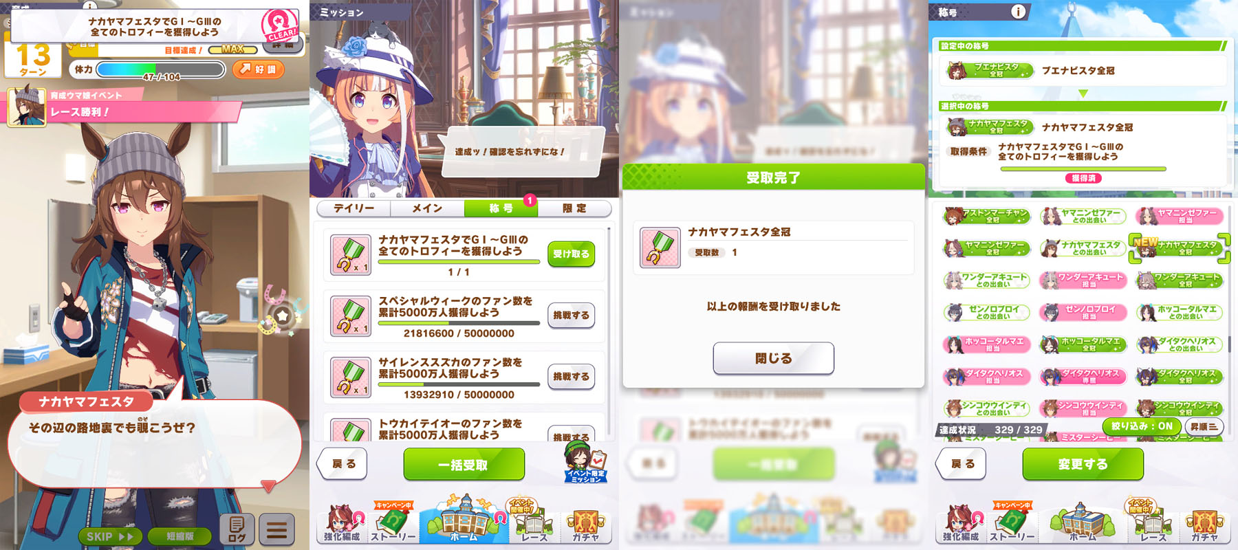 ナカヤマフェスタは、全冠称号を獲得しています。フェスタは、目標レースにクラシック三冠が含まれているため、最短手動周回数はTSC×2+L'Arcの 3周です。おまかせ育成で回収できない国内トロフィーは 9種です。