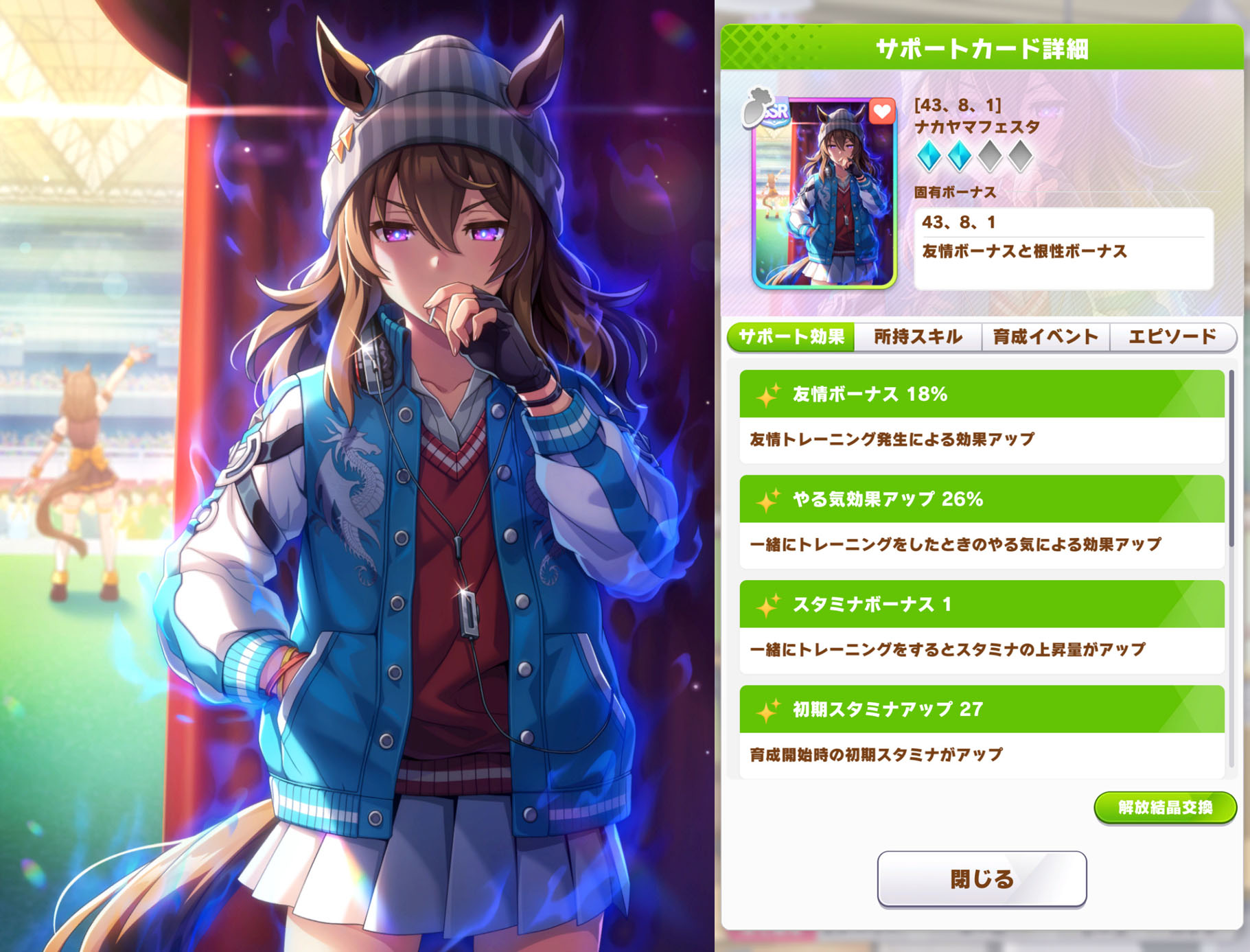 ナカヤマフェスタの初回育成結果は、ランクUB8でした。フェスタは所持スキルの面で中距離が適していますが、チムレ出走枠の都合上、長距離差しで育成しました。とりあえず、このフェスタをチムレに出走させて親愛度を稼ぎます。