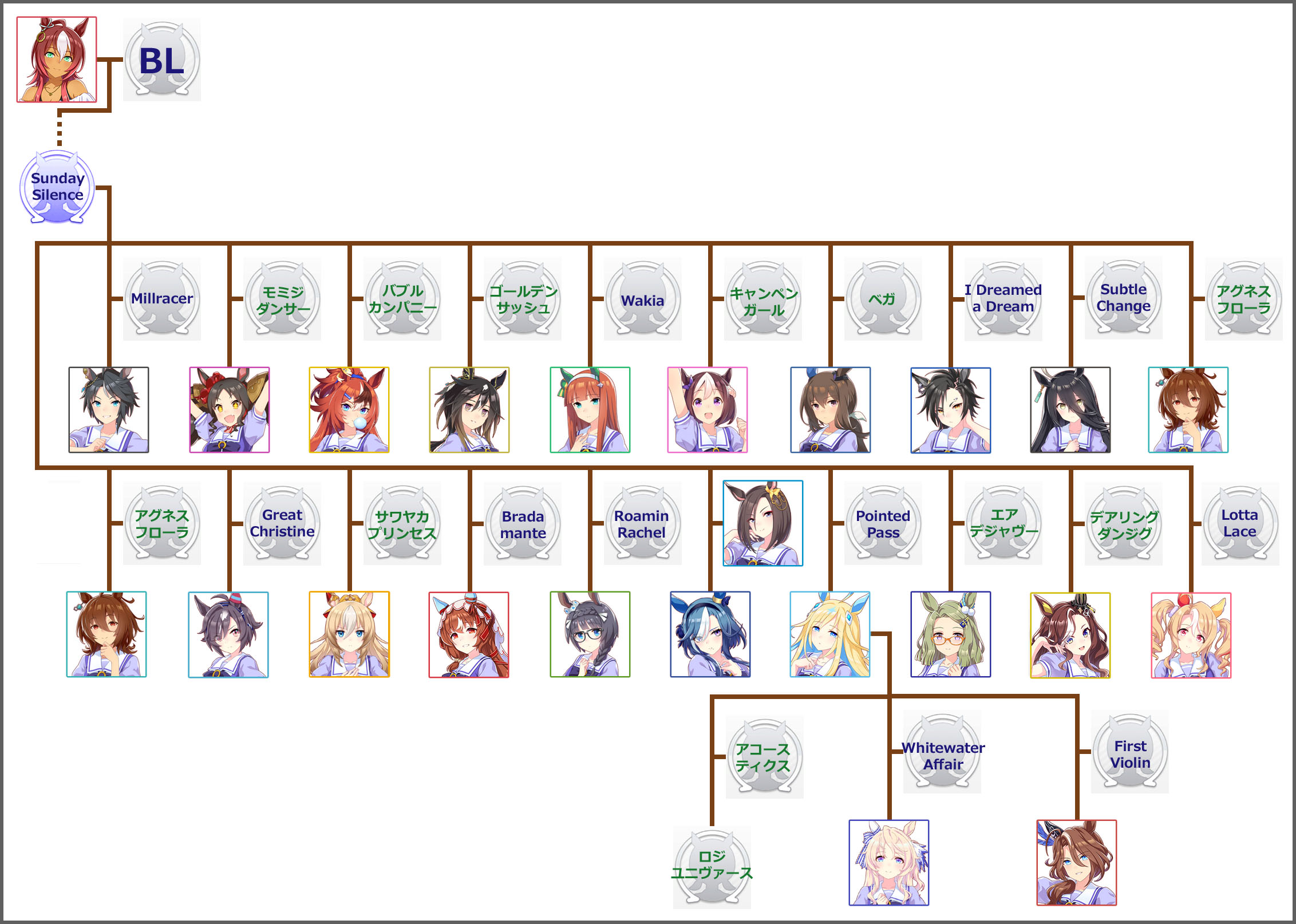 モチーフ馬のネオユニヴァースは、ダーレーアラビアン系の25世代目です。Sunday Silence産駒は、フジキセキ、マーベラスサンデー、バブルガムフェロー、ステイゴールド、サイレンススズカ、スペシャルウィーク、アドマイヤベガ、エアシャカール、マンハッタンカフェ、アグネスタキオン、ビリーヴ、スティルインラブ、ゼンノロブロイ、ネオユニヴァース、エアメサイア、デアリングハート、デュランダル、フサイチパンドラの18人のウマ娘がいます。この辺りの話は、マンハッタンカフェの育成ストーリーとして実装されています。ネオユニヴァース産駒には、ダービー馬のロジユニヴァース、エイシンフラッシュと同世代でGI×3勝のヴィクトワールピサ、チームカノープスに所属しているサウンズオブアースがいます。