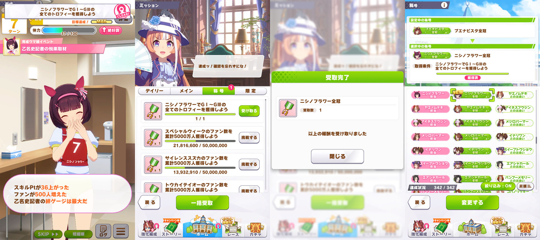 1小さな天才少女◯2伝説の証人◯3チームの絆◯4個人でもチームでも◯5アオハル魂爆発◯6時代を担う者◯7グッズパワー◯8クライマックス王者◯9勝利の栄光◯10伝説の再演◯11成功の立役者 ◯12King of Dance ◯13情熱ウマ娘 ◯14神の歌声 ◯15ビジュアル系 ◯16メンタリスト ◯17叡智の継承者 ◯18個性の継承者 19想いの伝達者 20力の伝道者 ◯21出藍の誉れ ◯22GM・チャンピオン ◯23磨き抜かれた素質 ◯24凱旋門賞ウマ娘◯25世界一の門を開く者◯26L'arc代表筆頭◯27課題克服◯28世界に橋を架ける者◯29最強アスリート◯30一流アスリート◯31マルチタレント◯32バーニングウマ娘◯33食と野菜の第一人者◯34口福の立役者◯35熟練農家ウマ娘◯36にんじんマスター◯37にんにくマスター◯38じゃがいもマスター◯39唐辛子マスター◯40いちごマスター◯41天才エンジニア◯42凄腕エンジニア◯43メカウマスター◯44オーバードライバー◯45未来へ繋ぐ伝説◯46時代に輝く一番星 47大歓声を呼ぶ者◯48揺るがぬ威光 49飽くなき挑戦者 50無敵の愛嬌◯51無人島の開拓者◯52絆を束ねるウマ娘 53スピード施設の匠◯54スタミナ施設の匠◯55パワー施設の匠 56根性施設の匠 57賢さ施設の匠 58海の家の匠 59至福のひととき◯60秘湯伝説の探究者◯61掘削職人◯62湧き出る活力◯63湯けむりウマ娘◯64スポ根魂◯65フィクサー 66次世代エンジン◯67マッスル万歳◯68ゴールデンブーツ◯69鋼のメンタル 70偉大なスプリンター◯71マイルの寵児◯72マイルの女王◯73無尽蔵のスタミナ◯74スキルマスター◯75技のデパート◯76時代の寵児◯77みんなのウマ娘◯78真・女王の精神◯79真・王者の精神◯80女王の精神◯81王者の精神◯82常勝ウマ娘◯83新時代の幕開け◯84レコードホルダー◯85GⅠハンター◯86唯一無二◯87伝説の歌姫◯88F・チャンピオン◯89レジェンドウマ娘 90神速マイラー◯91高速マイラー◯92ベストウマ娘◯93ワンダフルウマ娘◯94ダートGⅠ覇者◯95クイーンウマ娘◯96プリンセスウマ娘◯97ダート達人◯98砂上の超越者◯99砂の寵児◯100チームの繋がり◯101切磋琢磨◯102稼ぎ頭◯103栄光への第一歩◯104歌唱上手 ◯105天性のパフォーマー ◯106受け継ぎし者 ◯107知識の収集者 ◯108StarS◯109海外レース博士◯110相談上手◯111リンクマスター◯112反抗期◯113突然変異 114無敗の系譜◯115エリートウマ娘◯116パワフルウマ娘◯117超人ウマ娘 118自在ウマ娘◯119長短併せ呑む◯120オールラウンダー◯121二刀流◯122堅実派◯123スキルコレクター◯124闘魂 125大井の帝王◯126スピードスター◯127浪花節 128変則二冠ウマ娘◯129粗削りのマイル王◯130スピードクイーン◯131若きトップスタァ◯132アイアンウマ娘◯133完全無欠◯134春シニア三冠ウマ娘◯135秋シニア三冠ウマ娘◯136三冠ウマ娘◯137二冠ウマ娘◯138トリプルティアラ◯139ダブルティアラ◯140天皇賞春秋連覇◯141年末の覇者◯142グランプリ2世◯143シルバーコレクター◯144芝の鬼◯145ターフの魔術師◯146横綱相撲◯147生粋のステイヤー◯148新世代の怪物◯149GⅠウマ娘◯150カリスマウマ娘◯151凄腕スプリンター◯152ダートGⅠ帝王◯153ダートGⅠ怪物◯154ダートGⅠ強者◯155ヒロインウマ娘◯156光速スプリンター◯157盾の覇者 158春の覇者 159秋の覇者◯160ダート玄人◯161ダート上手◯162根幹距離の覇者◯163非根幹距離の覇者◯164ダートスプリンター◯165可憐なウマ娘◯166ダートの新星◯167ワールドウマ娘◯168ジュニアウマ娘◯169名人ウマ娘◯170達人ウマ娘◯171砂のスペシャリスト◯172川崎の鉄人 173ナイトパレード◯174ノスタルジーウマ娘◯175ダートの鬼◯176砂のスピードスター◯177二つのバ場の女王◯178ダートマイルの勇者◯179地方の完全女傑 180食のサポーター◯181シェフウマ娘◯182メカギアコレクター◯183チューナーウマ娘◯184レジェンドの愛弟子◯185心得の習熟者◯186島トレ通のウマ娘◯187建設計画リーダー◯188温泉マニア◯189温泉郷アンバサダー 190名バを訪ねて◯191直線番長 192全国区◯193ゴールドハンター◯194ジンクスブレイカー◯195型破りウマ娘◯196ミス・ドルフィン 197鋼のフィジカル◯198努力の天才◯199クイズ王◯200お笑い継承◯201お似合い継承◯202豪脚ウマ娘◯203雪の女王◯204レイニーウマ娘◯205ミス・クラウディ◯206勝利への執念◯207ダート巧者◯208問答無用◯209ブロンズコレクター 210意外性◯211無冠の帝王◯212瓢箪からウマ娘 213菊花賞への想い◯214ダービーへの想い◯215皐月賞への想い◯216オークスへの想い◯217桜花賞への想い◯218伝説の始まり◯219仕上がりウマ娘◯220暴れん坊ウマ娘◯221出遅れの大器 222韋駄天走り◯223ダービーウマ娘◯224オークスウマ娘◯225伏兵 226ワイドなウマ娘◯227連勝ウマ娘◯228安定感◯229第六感の持ち主◯230ミス・オールダート 231ミス・オールターフ◯232台風の目◯233GⅡウマ娘◯234重賞ウマ娘◯235メイクデビュー◯236ベテランウマ娘◯237北海道マスター◯238東北マスター◯239関東マスター◯240西日本マスター◯241小倉マスター◯242地方巡りの旅◯243地方観光◯244レイトショー◯245夕焼けのウマ娘◯246地方で名バを訪