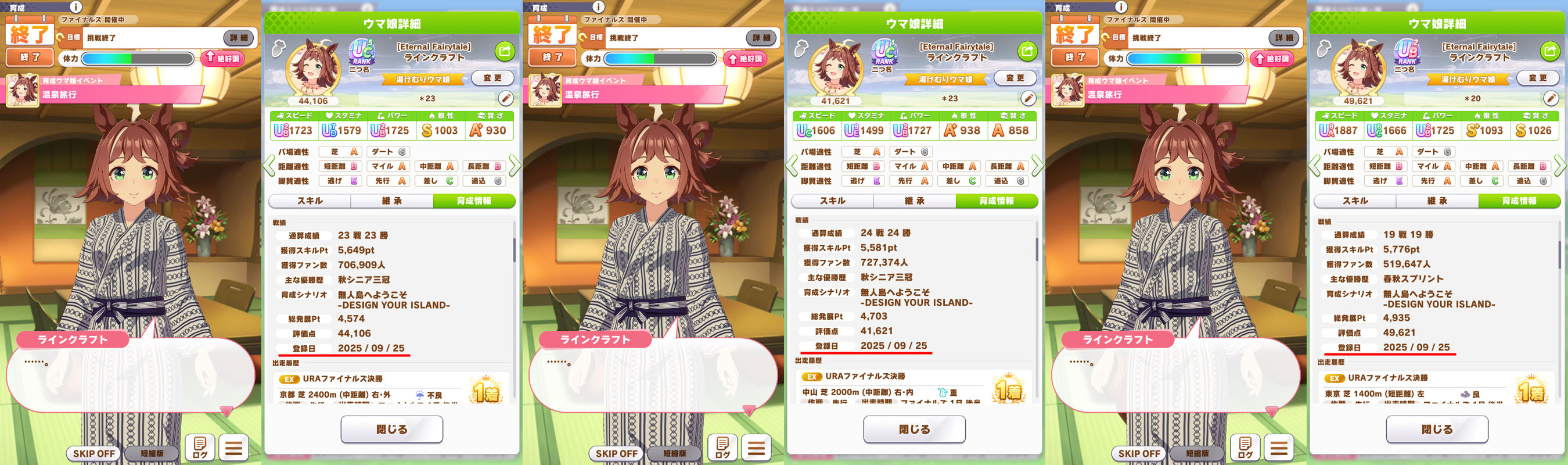 メルヘンクラフト(勝負服違いのラインクラフト)の初回育成結果は、ランクUB8でした。クラフトはマイラーですが、無人島で育成する都合上、中距離先行で育成しました。当面は、このクラフトをチムレに出走させて親愛度を稼ぎます。