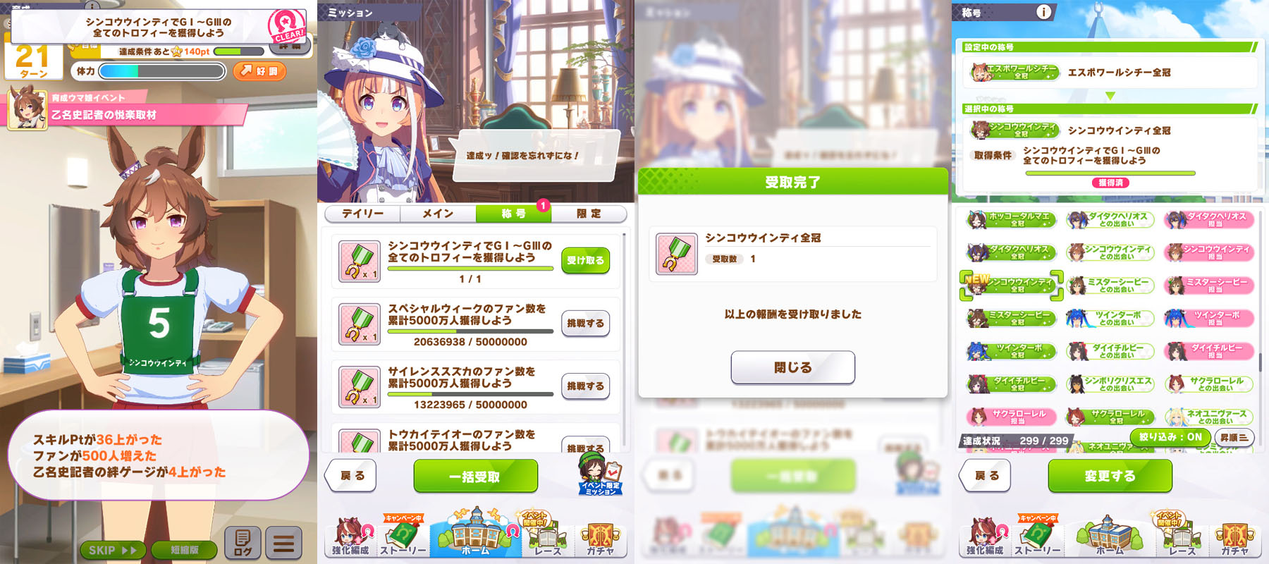 1噛みつきイタズラ娘◯2伝説の証人 3チームの絆 4個人でもチームでも 5アオハル魂爆発 6時代を担う者◯7グッズパワー◯8クライマックス王者◯9勝利の栄光◯10伝説の再演 11成功の立役者 12King of Dance 13情熱ウマ娘 14神の歌声 15ビジュアル系 16メンタリスト 17叡智の継承者 18個性の継承者 19想いの伝達者 20力の伝道者 21出藍の誉れ 22GM・チャンピオン 23磨き抜かれた素質 24凱旋門賞ウマ娘◯25世界一の門を開く者◯26L'arc代表筆頭◯27課題克服◯28世界に橋を架ける者◯29最強アスリート 30一流アスリート 31マルチタレント 32バーニングウマ娘 33食と野菜の第一人者 34口福の立役者 35熟練農家ウマ娘 36にんじんマスター 37にんにくマスター 38じゃがいもマスター 39唐辛子マスター 40いちごマスター 41天才エンジニア 42凄腕エンジニア 43メカウマスター 44オーバードライバー 45未来へ繋ぐ伝説 46時代に輝く一番星 47大歓声を呼ぶ者 48揺るがぬ威光 49飽くなき挑戦者 50無敵の愛嬌 51無人島の開拓者◯52絆を束ねるウマ娘◯53スピード施設の匠◯54スタミナ施設の匠◯55パワー施設の匠◯56根性施設の匠 57賢さ施設の匠 58海の家の匠 59湯けむりウマ娘◯60スポ根魂◯61フィクサー◯62次世代エンジン◯63マッスル万歳◯64ゴールデンブーツ◯65鋼のメンタル 66偉大なスプリンター◯67マイルの寵児◯68マイルの女王◯69無尽蔵のスタミナ◯70スキルマスター◯71技のデパート◯72時代の寵児◯73みんなのウマ娘◯74真・女王の精神◯75真・王者の精神◯76女王の精神◯77王者の精神◯78常勝ウマ娘◯79新時代の幕開け◯80レコードホルダー◯81GⅠハンター◯82唯一無二◯83伝説の歌姫◯84F・チャンピオン◯85レジェンドウマ娘 86神速マイラー◯87高速マイラー◯88ベストウマ娘 89ワンダフルウマ娘 90ダートGⅠ覇者 91クイーンウマ娘◯92プリンセスウマ娘◯93ダート達人 94砂上の超越者◯95砂の寵児◯96チームの繋がり 97切磋琢磨 98稼ぎ頭◯99栄光への第一歩◯100歌唱上手 101天性のパフォーマー 102受け継ぎし者 103知識の収集者 104StarS◯105海外レース博士◯106相談上手 107リンクマスター 108反抗期 109突然変異◯110無敗の系譜◯111エリートウマ娘 112パワフルウマ娘◯113超人ウマ娘◯114自在ウマ娘◯115長短併せ呑む 116オールラウンダー◯117二刀流◯118堅実派◯119スキルコレクター◯120闘魂◯121大井の帝王◯122スピードスター 123浪花節◯124変則二冠ウマ娘◯125粗削りのマイル王◯126スピードクイーン◯127若きトップスタァ◯128アイアンウマ娘◯129完全無欠◯130春シニア三冠ウマ娘◯131秋シニア三冠ウマ娘◯132三冠ウマ娘◯133二冠ウマ娘◯134トリプルティアラ◯135ダブルティアラ◯136天皇賞春秋連覇◯137年末の覇者 138グランプリ2世◯139シルバーコレクター 140芝の鬼◯141ターフの魔術師◯142横綱相撲◯143生粋のステイヤー◯144新世代の怪物◯145GⅠウマ娘◯146カリスマウマ娘 147凄腕スプリンター 148ダートGⅠ帝王◯149ダートGⅠ怪物◯150ダートGⅠ強者◯151ヒロインウマ娘◯152光速スプリンター 153盾の覇者◯154春の覇者◯155秋の覇者 156ダート玄人 157ダート上手◯158根幹距離の覇者◯159非根幹距離の覇者◯160ダートスプリンター 161可憐なウマ娘 162ダートの新星 163ワールドウマ娘 164ジュニアウマ娘 165名人ウマ娘◯166達人ウマ娘 167砂のスペシャリスト 168川崎の鉄人◯169ナイトパレード◯170ノスタルジーウマ娘◯171ダートの鬼◯172砂のスピードスター 173二つのバ場の女王 174ダートマイルの勇者◯175地方の完全女傑 176食のサポーター 177シェフウマ娘 178メカギアコレクター 179チューナーウマ娘 180レジェンドの愛弟子 181心得の習熟者 182島トレ通のウマ娘◯183建設計画リーダー◯184名バを訪ねて◯185直線番長 186全国区◯187ゴールドハンター◯188ジンクスブレイカー◯189型破りウマ娘 190ミス・ドルフィン 191鋼のフィジカル◯192努力の天才◯193クイズ王◯194お笑い継承 195お似合い継承◯196豪脚ウマ娘◯197雪の女王 198レイニーウマ娘◯199ミス・クラウディ◯200勝利への執念 201ダート巧者◯202問答無用◯203ブロンズコレクター 204意外性◯205無冠の帝王 206瓢箪からウマ娘◯207菊花賞への想い◯208ダービーへの想い◯209皐月賞への想い◯210オークスへの想い◯211桜花賞への想い◯212伝説の始まり◯213仕上がりウマ娘◯214暴れん坊ウマ娘◯215出遅れの大器 216韋駄天走り◯217ダービーウマ娘◯218オークスウマ娘◯219伏兵 220ワイドなウマ娘◯221連勝ウマ娘◯222安定感◯223第六感の持ち主◯224ミス・オールダート◯225ミス・オールターフ◯226台風の目◯227GⅡウマ娘◯228重賞ウマ娘◯229メイクデビュー◯230ベテランウマ娘◯231北海道マスター 232東北マスター◯233関東マスター◯234西日本マスター◯235小倉マスター◯236地方巡りの旅◯237地方観光◯238レイトショー◯239夕焼けのウマ娘◯240地方で名バを訪ねて