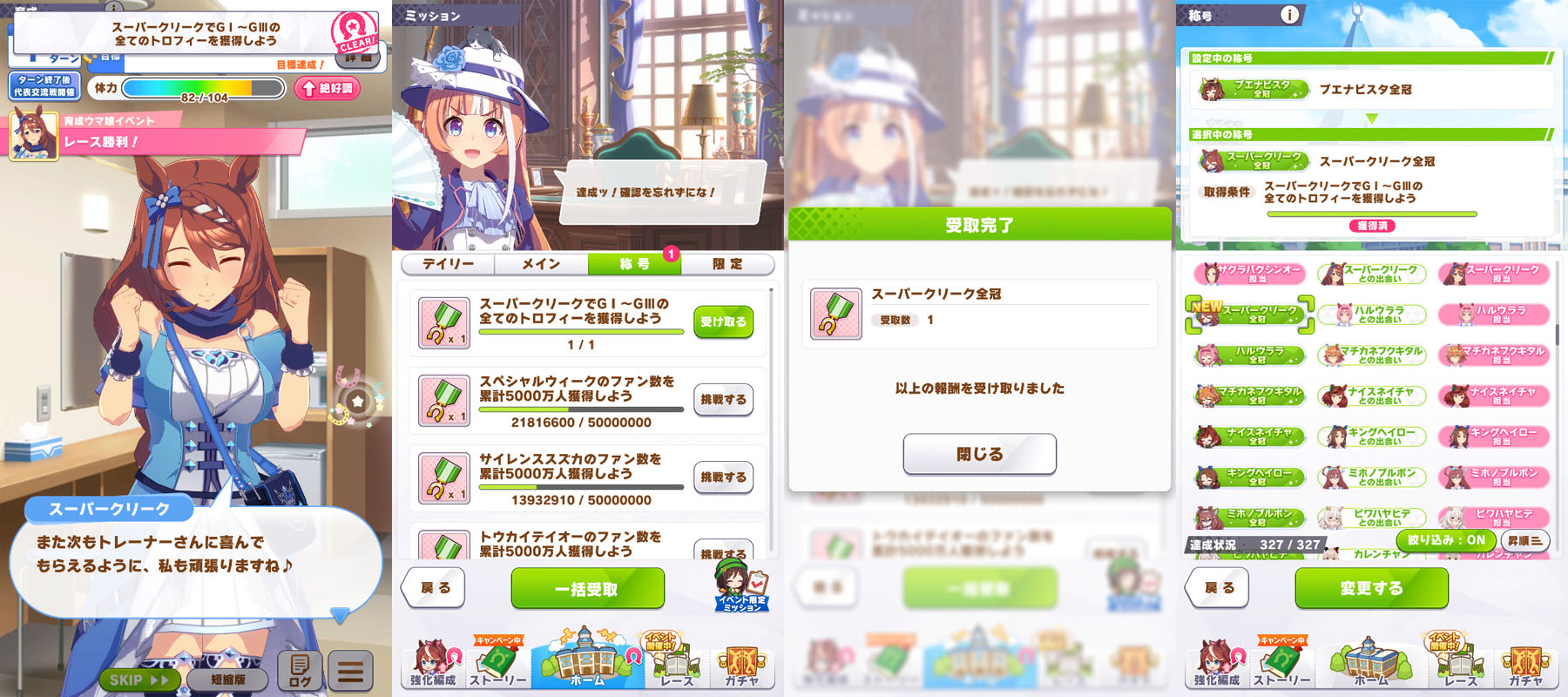 スーパークリークの固有二つ名「高速ステイヤー」は、簡単に取得することができます。2400m以上の目標レースが 4つあるため、2つ追加出走すればクリアできます。
