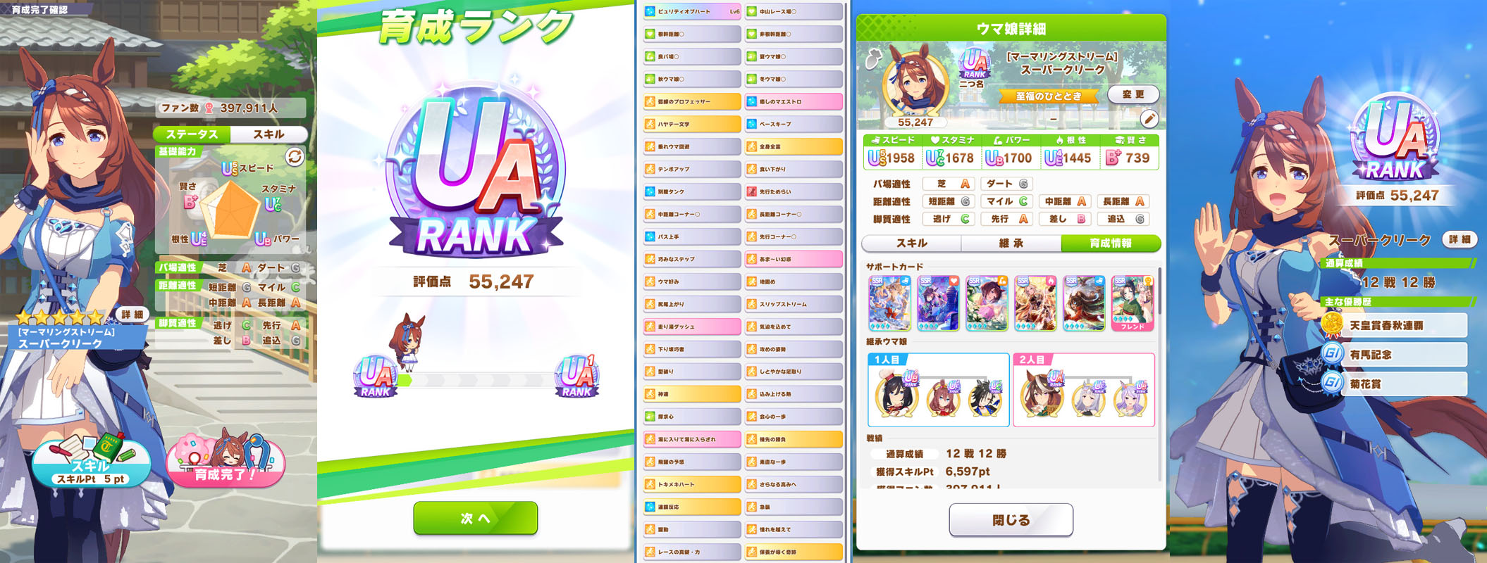 ランクUF7のスーパークリークが誕生しました、過去最高の評価点です。スタミナサポカを含まないS2PW2F編成で育成しましたが、それでもスタミナが1200を超えました。これまで、高ランクを出すにはスピード1500以上が必須と考えていたのですが、スピード、スタミナ、パワー、賢さの4ステータスが平均的に伸びた場合でも高ランクになるんですね。これは意外な結果でした。ちなみに、最後に踏んだ失敗率12%のトレが成功していれば、ランクUF8でした。ジュニア期に三女神が来なかったため、神速スキルも未取得です。