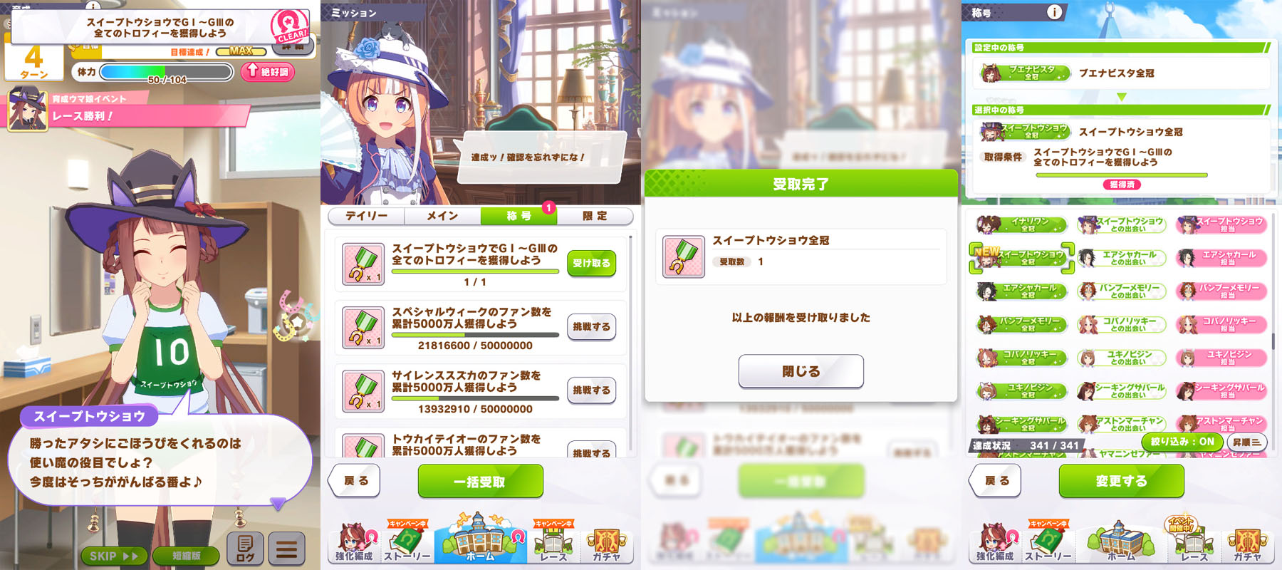 スイープトウショウは、全冠称号を獲得しています。スイーピーは、ダートG・短距離E・長距離Dですが、因子が揃っていれば一度に全バ場・全距離のトロフィーを回収できます。おまかせ育成で回収できない国内トロフィーは19種です。