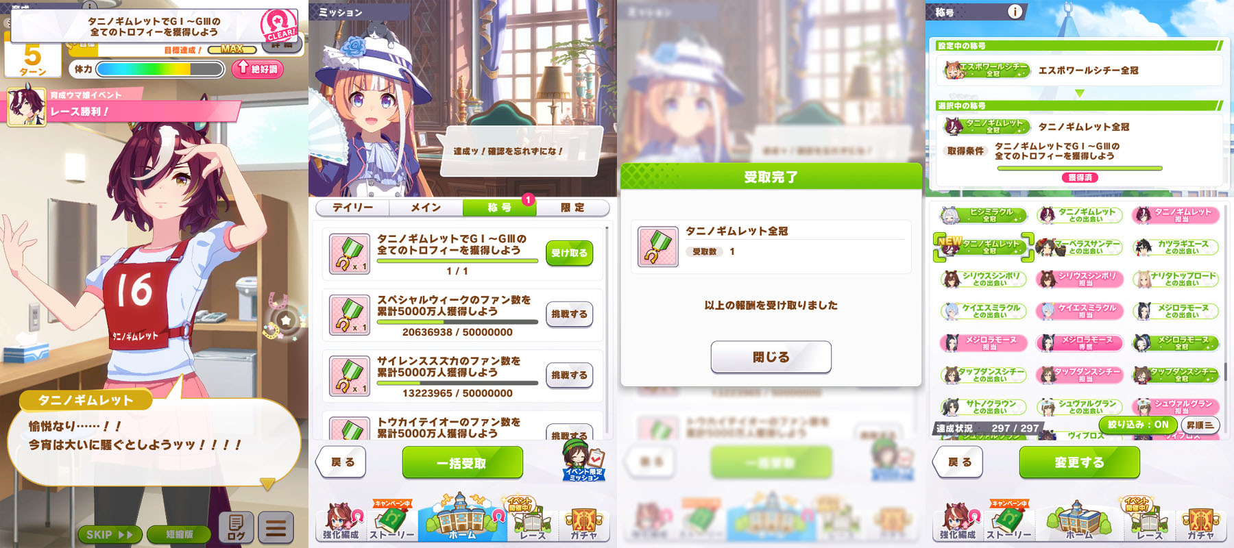 1耽美系破壊神◯2伝説の証人 3チームの絆 4個人でもチームでも 5アオハル魂爆発 6時代を担う者◯7グッズパワー◯8クライマックス王者◯9勝利の栄光◯10伝説の再演 11成功の立役者 12King of Dance 13情熱ウマ娘 14神の歌声 15ビジュアル系 16メンタリスト 17叡智の継承者 18個性の継承者 19想いの伝達者 20力の伝道者 21出藍の誉れ 22GM・チャンピオン 23磨き抜かれた素質 24凱旋門賞ウマ娘◯25世界一の門を開く者◯26L'arc代表筆頭◯27課題克服◯28世界に橋を架ける者◯29最強アスリート 30一流アスリート 31マルチタレント 32バーニングウマ娘 33食と野菜の第一人者 34口福の立役者 35熟練農家ウマ娘 36にんじんマスター 37にんにくマスター 38じゃがいもマスター 39唐辛子マスター 40いちごマスター 41天才エンジニア 42凄腕エンジニア 43メカウマスター 44オーバードライバー 45未来へ繋ぐ伝説◯46時代に輝く一番星◯47大歓声を呼ぶ者◯48揺るがぬ威光 49飽くなき挑戦者 50無敵の愛嬌◯51無人島の開拓者◯52絆を束ねるウマ娘◯53スピード施設の匠◯54スタミナ施設の匠◯55パワー施設の匠 56根性施設の匠 57賢さ施設の匠 58海の家の匠 59湯けむりウマ娘◯60スポ根魂 61フィクサー◯62次世代エンジン◯63マッスル万歳◯64ゴールデンブーツ◯65鋼のメンタル◯66偉大なスプリンター◯67マイルの寵児 68マイルの女王◯69無尽蔵のスタミナ◯70スキルマスター◯71技のデパート◯72時代の寵児◯73みんなのウマ娘◯74真・女王の精神 75真・王者の精神 76女王の精神◯77王者の精神 78常勝ウマ娘◯79新時代の幕開け◯80レコードホルダー◯81GⅠハンター◯82唯一無二◯83伝説の歌姫◯84F・チャンピオン◯85レジェンドウマ娘 86神速マイラー 87高速マイラー 88ベストウマ娘 89ワンダフルウマ娘 90ダートGⅠ覇者◯91クイーンウマ娘◯92プリンセスウマ娘◯93ダート達人 94砂上の超越者 95砂の寵児◯96チームの繋がり 97切磋琢磨 98稼ぎ頭◯99栄光への第一歩◯100歌唱上手 101天性のパフォーマー 102受け継ぎし者 103知識の収集者 104StarS◯105海外レース博士◯106相談上手 107リンクマスター 108反抗期 109突然変異◯110無敗の系譜◯111エリートウマ娘◯112パワフルウマ娘◯113超人ウマ娘 114自在ウマ娘◯115長短併せ呑む◯116オールラウンダー◯117二刀流◯118堅実派◯119スキルコレクター◯120闘魂◯121大井の帝王◯122スピードスター 123浪花節 124変則二冠ウマ娘◯125粗削りのマイル王◯126スピードクイーン◯127若きトップスタァ◯128アイアンウマ娘◯129完全無欠◯130春シニア三冠ウマ娘◯131秋シニア三冠ウマ娘◯132三冠ウマ娘 133二冠ウマ娘◯134トリプルティアラ◯135ダブルティアラ◯136天皇賞春秋連覇◯137年末の覇者◯138グランプリ2世◯139シルバーコレクター 140芝の鬼◯141ターフの魔術師◯142横綱相撲◯143生粋のステイヤー◯144新世代の怪物◯145GⅠウマ娘◯146カリスマウマ娘 147凄腕スプリンター 148ダートGⅠ帝王◯149ダートGⅠ怪物◯150ダートGⅠ強者◯151ヒロインウマ娘◯152光速スプリンター 153盾の覇者 154春の覇者 155秋の覇者 156ダート玄人◯157ダート上手◯158根幹距離の覇者◯159非根幹距離の覇者◯160ダートスプリンター 161可憐なウマ娘 162ダートの新星 163ワールドウマ娘◯164ジュニアウマ娘◯165名人ウマ娘◯166達人ウマ娘 167砂のスペシャリスト 168川崎の鉄人 169ナイトパレード◯170ノスタルジーウマ娘 171ダートの鬼◯172砂のスピードスター◯173二つのバ場の女王◯174ダートマイルの勇者◯175地方の完全女傑 176食のサポーター 177シェフウマ娘 178メカギアコレクター 179チューナーウマ娘 180レジェンドの愛弟子◯181心得の習熟者◯182島トレ通のウマ娘◯183建設計画リーダー◯184名バを訪ねて 185直線番長 186全国区◯187ゴールドハンター◯188ジンクスブレイカー◯189型破りウマ娘 190ミス・ドルフィン 191鋼のフィジカル◯192努力の天才◯193クイズ王◯194お笑い継承 195お似合い継承◯196豪脚ウマ娘◯197雪の女王 198レイニーウマ娘◯199ミス・クラウディ◯200勝利への執念◯201ダート巧者◯202問答無用◯203ブロンズコレクター 204意外性◯205無冠の帝王 206瓢箪からウマ娘◯207菊花賞への想い◯208ダービーへの想い◯209皐月賞への想い◯210オークスへの想い◯211桜花賞への想い◯212伝説の始まり 213仕上がりウマ娘◯214暴れん坊ウマ娘◯215出遅れの大器 216韋駄天走り◯217ダービーウマ娘◯218オークスウマ娘◯219伏兵 220ワイドなウマ娘◯221連勝ウマ娘◯222安定感◯223第六感の持ち主◯224ミス・オールダート 225ミス・オールターフ◯226台風の目◯227GⅡウマ娘◯228重賞ウマ娘◯229メイクデビュー◯230ベテランウマ娘◯231北海道マスター◯232東北マスター◯233関東マスター◯234西日本マスター◯235小倉マスター◯236地方巡りの旅◯237地方観光◯238レイトショー◯239夕焼けのウマ娘◯240地方で名バを訪ねて