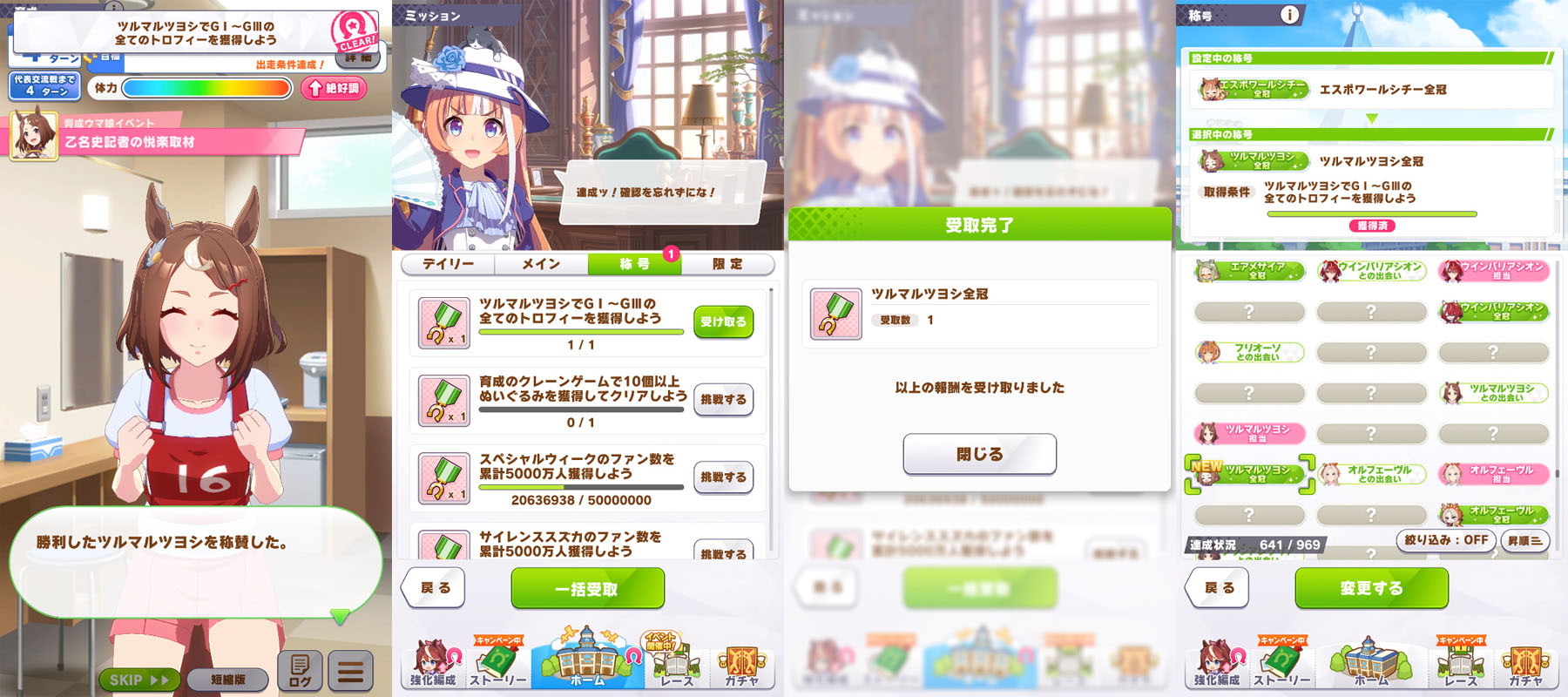 1全力前向きツヨシ◯2伝説の証人 3チームの絆 4個人でもチームでも 5アオハル魂爆発 6時代を担う者◯7グッズパワー◯8クライマックス王者◯9勝利の栄光◯10伝説の再演 11成功の立役者 12King of Dance 13情熱ウマ娘 14神の歌声 15ビジュアル系 16メンタリスト 17叡智の継承者 18個性の継承者 19想いの伝達者 20力の伝道者 21出藍の誉れ 22GM・チャンピオン 23磨き抜かれた素質 24凱旋門賞ウマ娘◯25世界一の門を開く者◯26L'arc代表筆頭◯27課題克服◯28世界に橋を架ける者◯29最強アスリート 30一流アスリート 31マルチタレント 32バーニングウマ娘 33食と野菜の第一人者 34口福の立役者 35熟練農家ウマ娘 36にんじんマスター 37にんにくマスター 38じゃがいもマスター 39唐辛子マスター 40いちごマスター 41天才エンジニア 42凄腕エンジニア 43メカウマスター 44オーバードライバー 45未来へ繋ぐ伝説◯46時代に輝く一番星 47大歓声を呼ぶ者◯48揺るがぬ威光 49飽くなき挑戦者 50無敵の愛嬌◯51無人島の開拓者◯52絆を束ねるウマ娘 53スピード施設の匠◯54スタミナ施設の匠◯55パワー施設の匠 56根性施設の匠 57賢さ施設の匠 58海の家の匠 59湯けむりウマ娘◯60スポ根魂◯61フィクサー◯62次世代エンジン◯63マッスル万歳◯64ゴールデンブーツ◯65鋼のメンタル 66偉大なスプリンター◯67マイルの寵児◯68マイルの女王◯69無尽蔵のスタミナ◯70スキルマスター◯71技のデパート◯72時代の寵児◯73みんなのウマ娘◯74真・女王の精神◯75真・王者の精神 76女王の精神◯77王者の精神 78常勝ウマ娘◯79新時代の幕開け◯80レコードホルダー◯81GⅠハンター◯82唯一無二◯83伝説の歌姫◯84F・チャンピオン◯85レジェンドウマ娘 86神速マイラー◯87高速マイラー◯88ベストウマ娘 89ワンダフルウマ娘 90ダートGⅠ覇者 91クイーンウマ娘◯92プリンセスウマ娘◯93ダート達人 94砂上の超越者 95砂の寵児◯96チームの繋がり 97切磋琢磨 98稼ぎ頭◯99栄光への第一歩◯100歌唱上手 101天性のパフォーマー 102受け継ぎし者 103知識の収集者 104StarS◯105海外レース博士◯106相談上手 107リンクマスター 108反抗期 109突然変異◯110無敗の系譜◯111エリートウマ娘◯112パワフルウマ娘◯113超人ウマ娘 114自在ウマ娘◯115長短併せ呑む◯116オールラウンダー◯117二刀流◯118堅実派◯119スキルコレクター◯120闘魂 121大井の帝王 122スピードスター 123浪花節 124変則二冠ウマ娘◯125粗削りのマイル王◯126スピードクイーン◯127若きトップスタァ◯128アイアンウマ娘◯129完全無欠◯130春シニア三冠ウマ娘◯131秋シニア三冠ウマ娘◯132三冠ウマ娘 133二冠ウマ娘◯134トリプルティアラ◯135ダブルティアラ◯136天皇賞春秋連覇◯137年末の覇者◯138グランプリ2世◯139シルバーコレクター◯140芝の鬼◯141ターフの魔術師◯142横綱相撲◯143生粋のステイヤー◯144新世代の怪物◯145GⅠウマ娘◯146カリスマウマ娘 147凄腕スプリンター 148ダートGⅠ帝王◯149ダートGⅠ怪物◯150ダートGⅠ強者◯151ヒロインウマ娘◯152光速スプリンター 153盾の覇者 154春の覇者 155秋の覇者◯156ダート玄人 157ダート上手◯158根幹距離の覇者◯159非根幹距離の覇者◯160ダートスプリンター 161可憐なウマ娘 162ダートの新星 163ワールドウマ娘 164ジュニアウマ娘 165名人ウマ娘 166達人ウマ娘 167砂のスペシャリスト 168川崎の鉄人 169ナイトパレード◯170ノスタルジーウマ娘◯171ダートの鬼◯172砂のスピードスター◯173二つのバ場の女王◯174ダートマイルの勇者 175地方の完全女傑 176食のサポーター 177シェフウマ娘 178メカギアコレクター 179チューナーウマ娘 180レジェンドの愛弟子◯181心得の習熟者◯182島トレ通のウマ娘◯183建設計画リーダー◯184名バを訪ねて 185直線番長 186全国区◯187ゴールドハンター 188ジンクスブレイカー◯189型破りウマ娘 190ミス・ドルフィン 191鋼のフィジカル 192努力の天才◯193クイズ王◯194お笑い継承 195お似合い継承◯196豪脚ウマ娘◯197雪の女王 198レイニーウマ娘◯199ミス・クラウディ◯200勝利への執念 201ダート巧者◯202問答無用◯203ブロンズコレクター 204意外性◯205無冠の帝王 206瓢箪からウマ娘◯207菊花賞への想い◯208ダービーへの想い◯209皐月賞への想い◯210オークスへの想い◯211桜花賞への想い◯212伝説の始まり◯213仕上がりウマ娘◯214暴れん坊ウマ娘◯215出遅れの大器 216韋駄天走り 217ダービーウマ娘◯218オークスウマ娘◯219伏兵 220ワイドなウマ娘◯221連勝ウマ娘◯222安定感◯223第六感の持ち主◯224ミス・オールダート 225ミス・オールターフ◯226台風の目◯227GⅡウマ娘◯228重賞ウマ娘◯229メイクデビュー◯230ベテランウマ娘◯231北海道マスター 232東北マスター 233関東マスター◯234西日本マスター◯235小倉マスター 236地方巡りの旅◯237地方観光◯238レイトショー◯239夕焼けのウマ娘◯240地方で名バを訪ねて