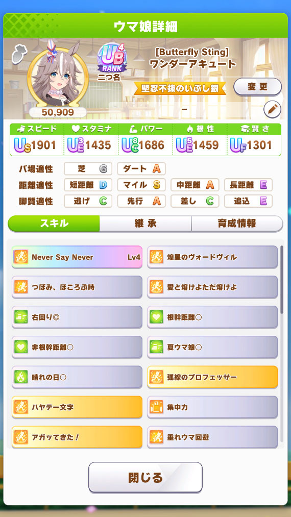 ワンダーアキュートの固有二つ名「堅忍不抜のいぶし銀」の取得条件は、史実の勝ち鞍である 3レースに勝利する必要があります。全て目標レースに含まれているため、普通に育成するだけで取得することができます。