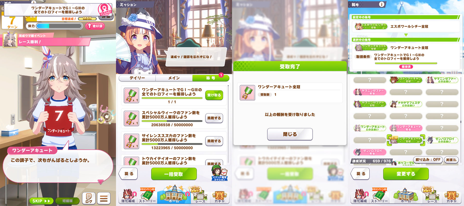 1堅忍不抜のいぶし銀◯2伝説の証人 3チームの絆 4個人でもチームでも 5アオハル魂爆発 6時代を担う者◯7グッズパワー◯8クライマックス王者◯9勝利の栄光◯10伝説の再演 11成功の立役者 12King of Dance 13情熱ウマ娘 14神の歌声 15ビジュアル系 16メンタリスト 17叡智の継承者 18個性の継承者 19想いの伝達者 20力の伝道者 21出藍の誉れ 22GM・チャンピオン 23磨き抜かれた素質 24凱旋門賞ウマ娘◯25世界一の門を開く者◯26L'arc代表筆頭◯27課題克服◯28世界に橋を架ける者◯29最強アスリート 30一流アスリート 31マルチタレント 32バーニングウマ娘 33食と野菜の第一人者 34口福の立役者 35熟練農家ウマ娘 36にんじんマスター 37にんにくマスター 38じゃがいもマスター 39唐辛子マスター 40いちごマスター 41天才エンジニア 42凄腕エンジニア 43メカウマスター 44オーバードライバー 45未来へ繋ぐ伝説 46時代に輝く一番星 47大歓声を呼ぶ者 48揺るがぬ威光 49飽くなき挑戦者 50無敵の愛嬌 51無人島の開拓者◯52絆を束ねるウマ娘 53スピード施設の匠◯54スタミナ施設の匠 55パワー施設の匠◯56根性施設の匠 57賢さ施設の匠 58海の家の匠 59至福のひととき◯60秘湯伝説の探究者◯61掘削職人◯62湧き出る活力◯63湯けむりウマ娘◯64スポ根魂 65フィクサー 66次世代エンジン◯67マッスル万歳◯68ゴールデンブーツ◯69鋼のメンタル 70偉大なスプリンター◯71マイルの寵児◯72マイルの女王◯73無尽蔵のスタミナ◯74スキルマスター◯75技のデパート◯76時代の寵児◯77みんなのウマ娘◯78真・女王の精神◯79真・王者の精神◯80女王の精神◯81王者の精神◯82常勝ウマ娘◯83新時代の幕開け◯84レコードホルダー◯85GⅠハンター◯86唯一無二◯87伝説の歌姫◯88F・チャンピオン◯89レジェンドウマ娘◯90神速マイラー◯91高速マイラー◯92ベストウマ娘 93ワンダフルウマ娘 94ダートGⅠ覇者 95クイーンウマ娘◯96プリンセスウマ娘◯97ダート達人 98砂上の超越者◯99砂の寵児◯100チームの繋がり 101切磋琢磨 102稼ぎ頭◯103栄光への第一歩◯104歌唱上手 105天性のパフォーマー 106受け継ぎし者 107知識の収集者 108StarS◯109海外レース博士◯110相談上手 111リンクマスター 112反抗期 113突然変異◯114無敗の系譜◯115エリートウマ娘◯116パワフルウマ娘◯117超人ウマ娘 118自在ウマ娘 119長短併せ呑む 120オールラウンダー◯121二刀流◯122堅実派◯123スキルコレクター◯124闘魂◯125大井の帝王◯126スピードスター◯127浪花節◯128変則二冠ウマ娘◯129粗削りのマイル王◯130スピードクイーン◯131若きトップスタァ◯132アイアンウマ娘◯133完全無欠◯134春シニア三冠ウマ娘◯135秋シニア三冠ウマ娘◯136三冠ウマ娘◯137二冠ウマ娘◯138トリプルティアラ◯139ダブルティアラ◯140天皇賞春秋連覇◯141年末の覇者 142グランプリ2世◯143シルバーコレクター◯144芝の鬼◯145ターフの魔術師◯146横綱相撲◯147生粋のステイヤー◯148新世代の怪物◯149GⅠウマ娘◯150カリスマウマ娘 151凄腕スプリンター 152ダートGⅠ帝王◯153ダートGⅠ怪物◯154ダートGⅠ強者◯155ヒロインウマ娘◯156光速スプリンター 157盾の覇者◯158春の覇者◯159秋の覇者◯160ダート玄人 161ダート上手◯162根幹距離の覇者◯163非根幹距離の覇者◯164ダートスプリンター 165可憐なウマ娘 166ダートの新星 167ワールドウマ娘 168ジュニアウマ娘 169名人ウマ娘 170達人ウマ娘 171砂のスペシャリスト 172川崎の鉄人◯173ナイトパレード◯174ノスタルジーウマ娘◯175ダートの鬼◯176砂のスピードスター◯177二つのバ場の女王◯178ダートマイルの勇者◯179地方の完全女傑 180食のサポーター 181シェフウマ娘 182メカギアコレクター 183チューナーウマ娘 184レジェンドの愛弟子 185心得の習熟者 186島トレ通のウマ娘◯187建設計画リーダー◯188温泉マニア◯189温泉郷アンバサダー◯190名バを訪ねて 191直線番長 192全国区◯193ゴールドハンター◯194ジンクスブレイカー◯195型破りウマ娘◯196ミス・ドルフィン 197鋼のフィジカル◯198努力の天才◯199クイズ王◯200お笑い継承 201お似合い継承◯202豪脚ウマ娘◯203雪の女王 204レイニーウマ娘◯205ミス・クラウディ◯206勝利への執念 207ダート巧者◯208問答無用◯209ブロンズコレクター 210意外性◯211無冠の帝王 212瓢箪からウマ娘◯213菊花賞への想い◯214ダービーへの想い◯215皐月賞への想い◯216オークスへの想い◯217桜花賞への想い◯218伝説の始まり◯219仕上がりウマ娘◯220暴れん坊ウマ娘◯221出遅れの大器 222韋駄天走り◯223ダービーウマ娘◯224オークスウマ娘◯225伏兵 226ワイドなウマ娘◯227連勝ウマ娘◯228安定感◯229第六感の持ち主◯230ミス・オールダート◯231ミス・オールターフ◯232台風の目◯233GⅡウマ娘◯234重賞ウマ娘◯235メイクデビュー◯236ベテランウマ娘◯237北海道マスター 238東北マスター◯239関東マスター◯240西日本マスター◯241小倉マスター 242地方巡りの旅◯243地方観光◯244レイトショー◯245夕焼けのウマ娘◯246地方で名バを訪ねて